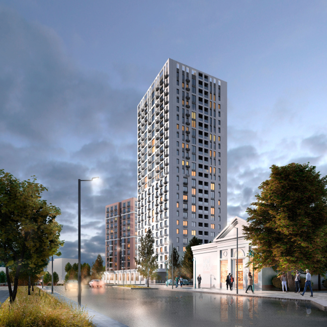 Пластике и тактильности первых этажей, формирующих пространство улицы, уделили особое внимание. Входы в жилой комплекс отмечены порталами в высоту двух этажей, ритмичными «языками» козырьков, а также декором из просечного металла. Здесь архитекторы предусмотрительно оставляют место для работы дизайнеров – планируется, что для комплекса будет разработан дизайн-код, и ниша портала – одно из мест, где можно применять его решения.