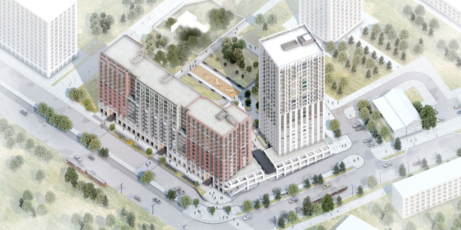 Учитывая заданные ограничения, архитекторы не могли работать ни с силуэтом, ни с мастер-планом. Несмотря на это бюро ОСА удалось использовать характерные приемы и вдохнуть в ТЭПы жизнь. Прежде всего нужно было справиться с монотонностью и найти решения, которые могли бы чем-то компенсировать гуманность ушедшей среды двухэтажных домиков, пусть и сильно деградировавшей.