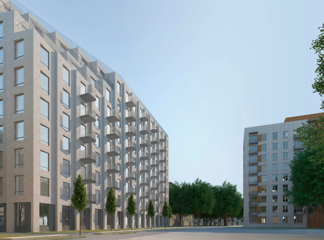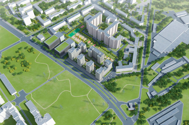 Будущий жилой комплекс выйдет на проспект Маршала Блюхера в квартале, ограниченном Лабораторной улицей и Кондратьевским проспектом. Пять корпусов формируют проницаемый прямоугольный квартал с четырьмя акцентными секциями вдоль проспекта, которые объединяет галерея ритейла – часть ее перейдет к администрации района. Высота запрашивается предельно допустимая – 54 метра, зато комплекс приобретает силуэт, заметно понижаясь во «флангах»: один из них смотрит в окна многоэтажного паркинга соседнего жилого комплекса, а другой – на зеленую площадку с фрагментом ЛЭП. Проект предусматривает детский сад на 200 малышей, а детей постарше должна вместить школа в соседнем квартале, рассчитанная на 1340 мест – реальность этой возможности подтверждается письмом администрации.