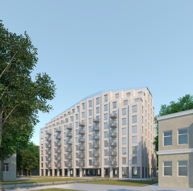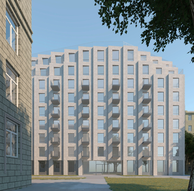 По существу, рассматриваемый дом – это уплотнительная застройка. Но в Петербурге, как опять же выяснилось, бывает только регенерация среды с дальнейшим развитием. Поскольку дом располагается в глубине квартала, то допустимая его высота – 33 метра, чем заказчик и пользуется в полной мере. Объем первых семи этажей – более или менее простой параллелепипед с пропорциями ясными, как . Два аттиковых этажа добавляют интриги – выступы террас усложнены «складками» стен, все вместе образует объемный паттерн со смещенной осью симметрии, из-за которой вид сверху вызывает много лишних ассоциаций.