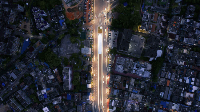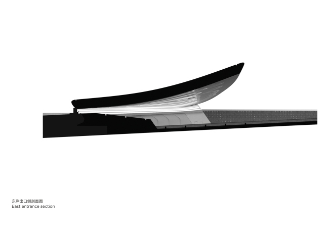Въездные порталы в Восточный тоннель Вэньмин Фото © Xia Zhi. Предоставлено Penda China Множество маленьких светильников, встроенных в швы между панелями, позволяют оболочке мягко светиться ночью – подобно медузе или глубоководной рыбе.