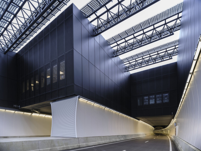 Свой тоннель архитекторы называют самым экологичным в Европе. Например, мелкая пыль отфильтровывается при въезде в него, что снижает ее выброс на 50%. Технические корпуса над въездами снабжены навесом из солнечных батарей, которые создают переходную световую зону: она спасает водителей от «ослепления», когда они попадают в тоннель или покидают его. Кроме того, эти батареи полностью обеспечивают эти подсобные сооружения энергией.