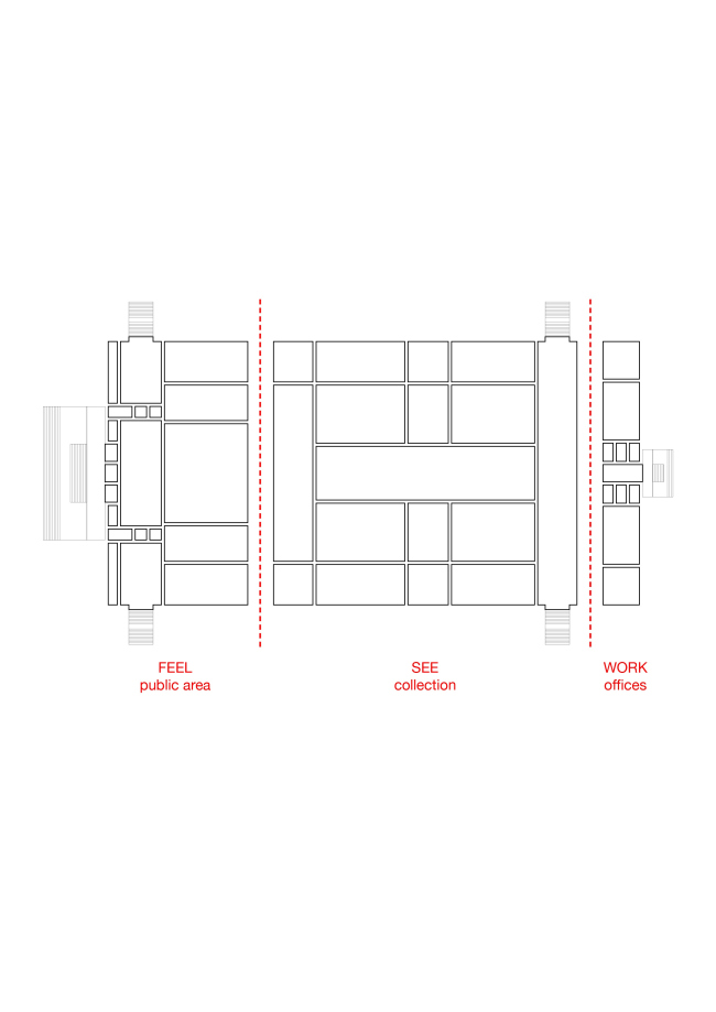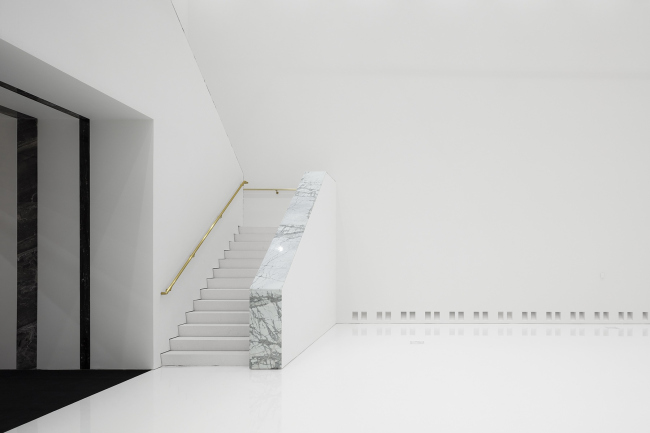 В новые залы посетитель приходит из расположенного на том же первом этаже вестибюля, где теперь появилась информационная зона, а рядом – кафе и аудитория. Ажурная винтовая лестница спускается на цокольный этаж (по сути – на уровень улицы), где расположились библиотека, гардероб и вход для туристических групп.