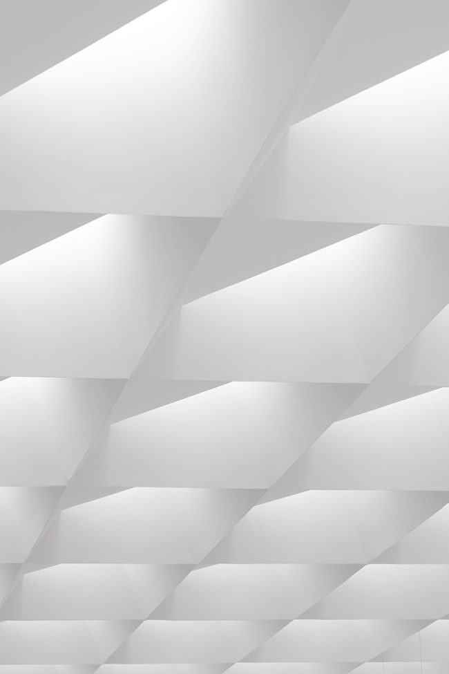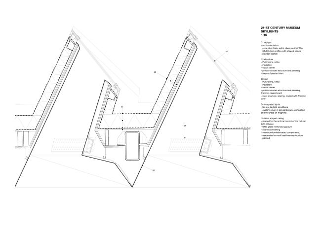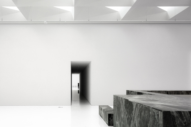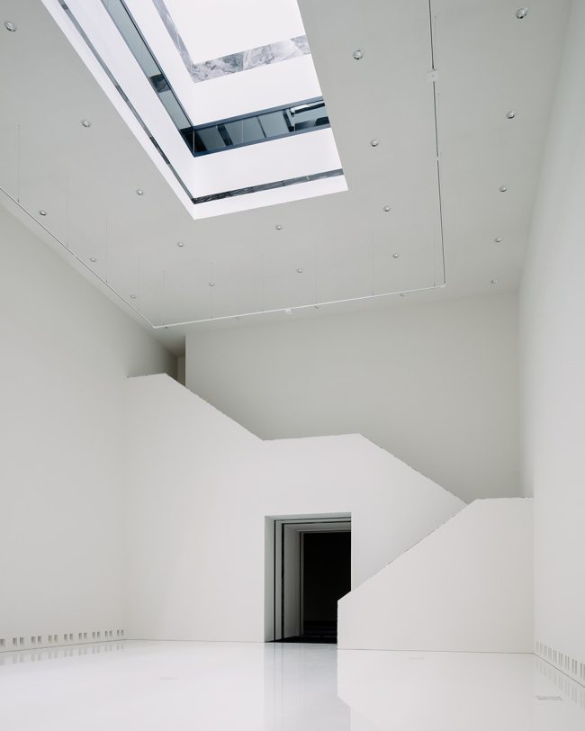 Солнечный свет попадает в новую часть сквозь остекление кровли в форме эффектных треугольных элементов. Они ориентированы на север, чтобы улавливать оптимальный для выставочных залов свет, однако схема освещения также рассчитана на сезонное снижение его интенсивности – и компенсацию этих колебаний. Распределителями света служат четыре световых колодца высотой 23 м, ощущение отличной освещенности в белых залах обеспечивают и блестящие полы. Это все ведет к некоторой дематериализации пространства, особому контрасту с плотными, насыщенными старыми залами, хотя «мостик» с ними перекинут с помощью использования мрамора.