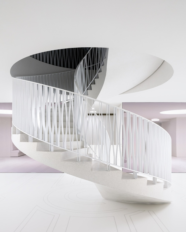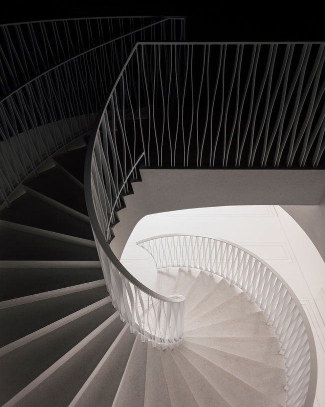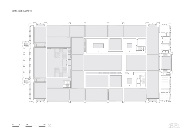 Особый, контрастный этаж составляют «синие кабинеты» для экспонирования гравюр и рисунков. Их темный по цвету и освещению ярус – прослойка между первым и третьим белыми сияющими этажами.