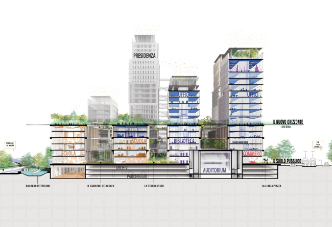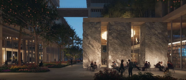 Запланированы три площади, вокруг которых на первых этажах расположатся, книжный магазин, кафе, рестораны, спортивный и wellness- центры, церковь, детский сад и школа. Также в комплекс войдут аудитория, библиотека, коворкинг – и офисы чиновников. Все это охватит площадь в 120 000 м2, а подземная парковка даст еще 60 000 м2.