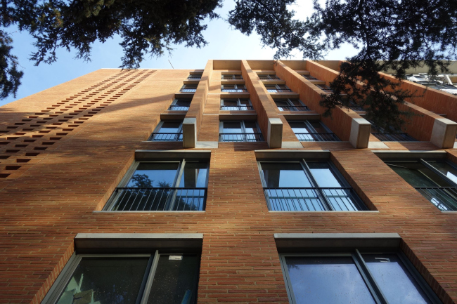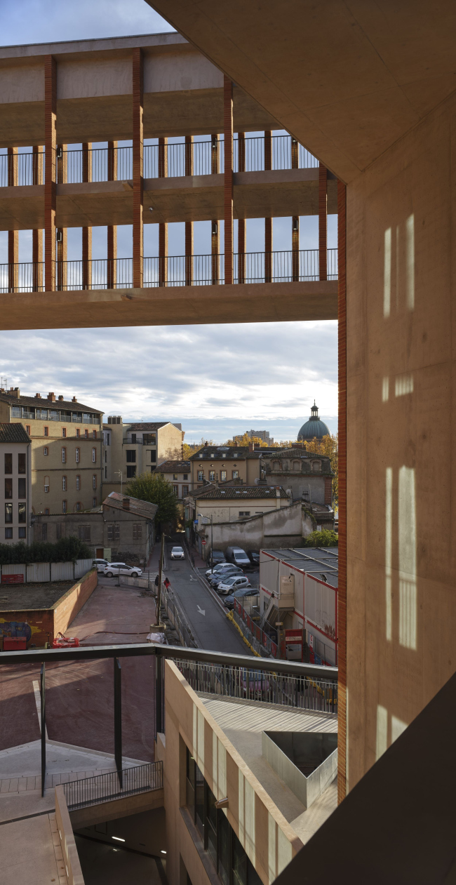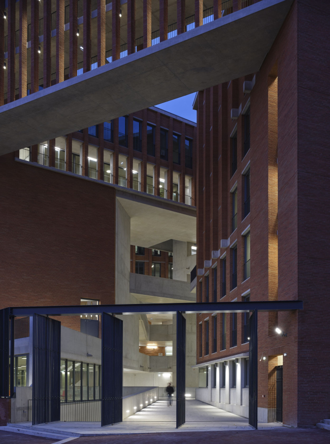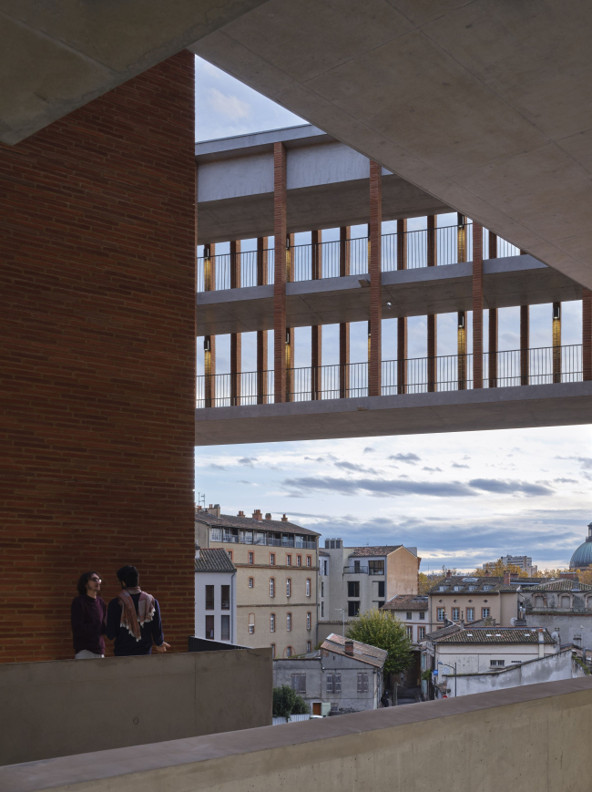Композиция школы вдохновлена «фрагментами Тулузы»: мостами, набережными, крепостными стенами, аллеями, контрфорсами, башнями из кирпича и камня, арками и клуатрами, прохладными интерьерами. Часть здания с кабинетами составляют отдельные «бруски» глубиной 10,8 м, что обеспечивает помещения естественной вентиляцией и освещением. Особое внимание уделено ориентации каждого «бруска», от нее зависит степень проницаемости фасада. Террасы и семинарские аудитории, где мало окон, защищают здание от солнца с юга и затеняют его.Тулузская школа экономикиФото © Dennis Gilbert
