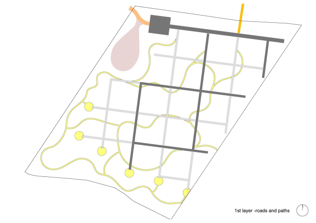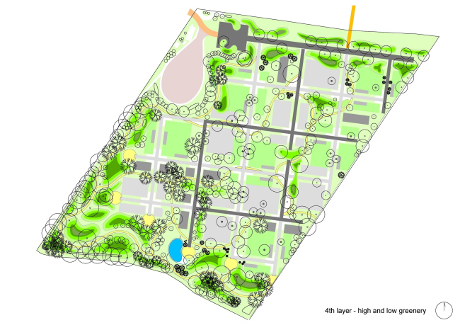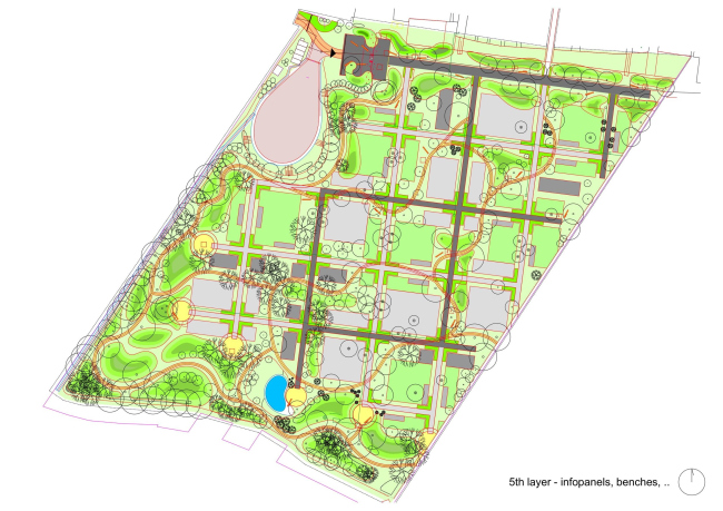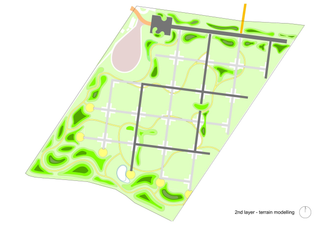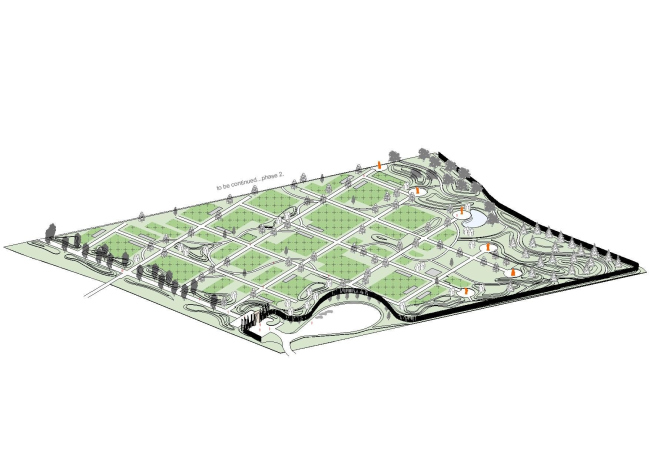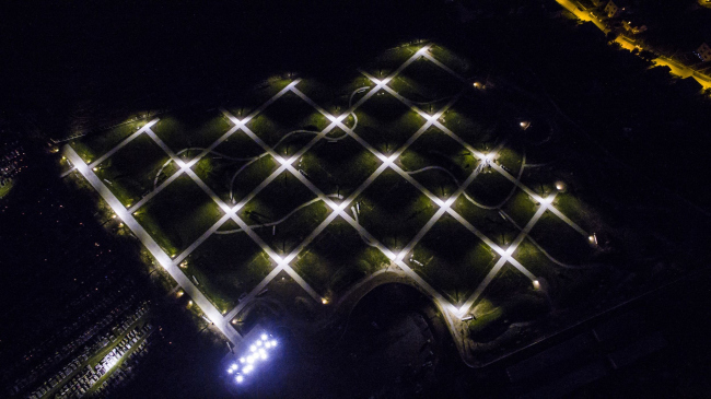 На плоском поле архитекторы сформировали ландшафт из невысоких холмов. Этот органический рельеф разлинован бетонными дорожками по сетке с квадратом 40 м х 40 м. Дополнительными «регулярными» элементами стали ворота из стали кортен (символа старения, по мысли авторов) и бетонные ограды.