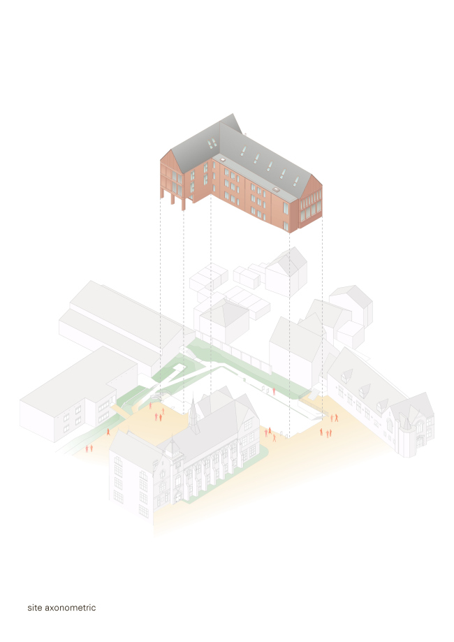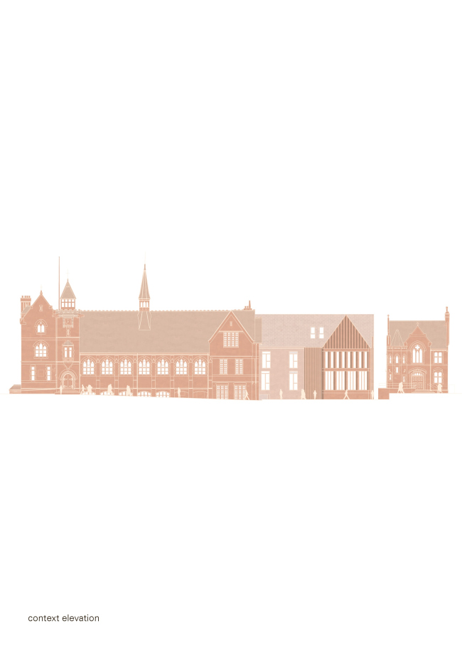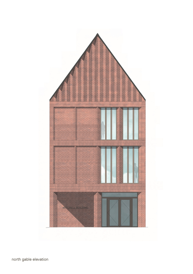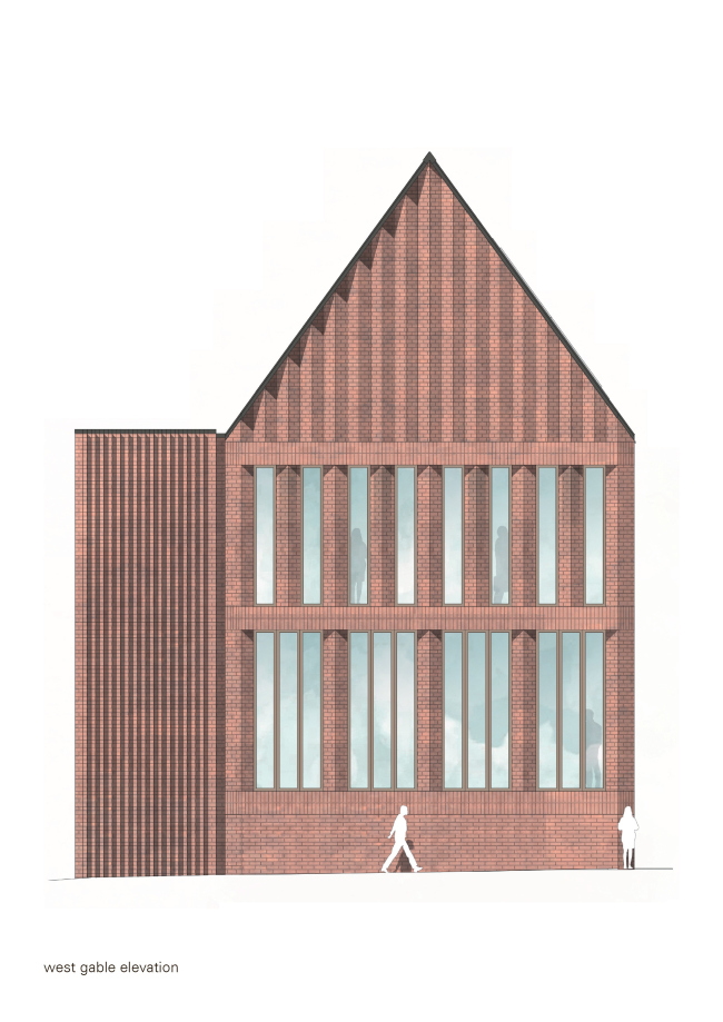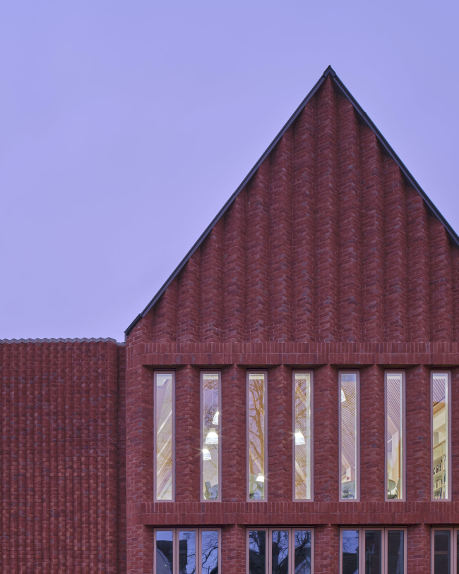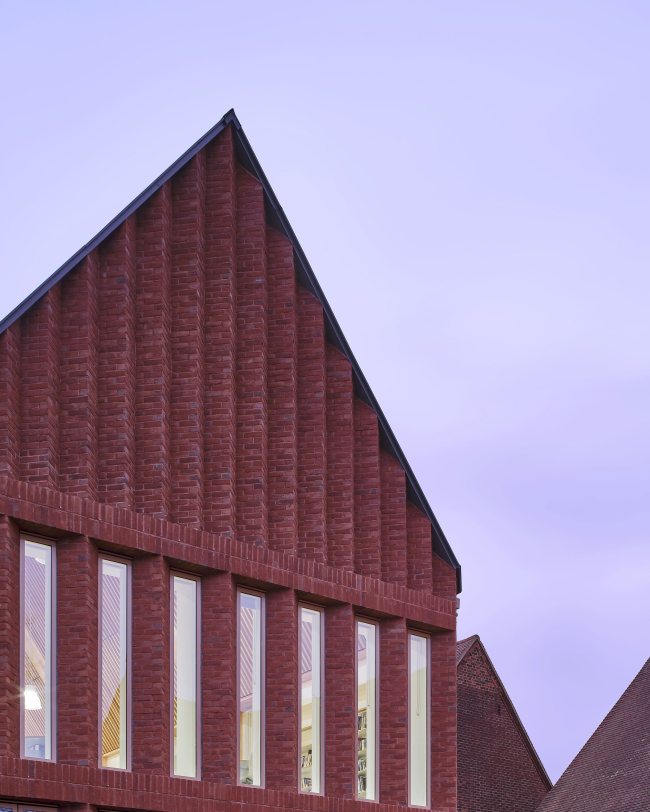 Новый корпус развивает мотивы, заимствованные у исторических корпусов: выразительный щипец, профили из выложенного под углом в 45 градусов кирпича как версия декора из треугольников, вместо горизонтальных поясов из камня – перемычки из вертикальной кладки.