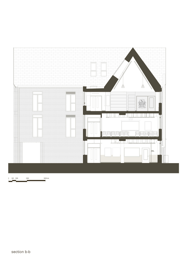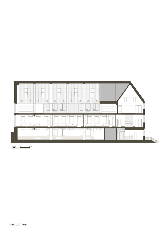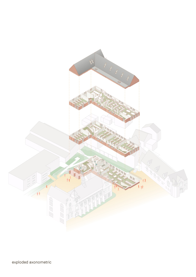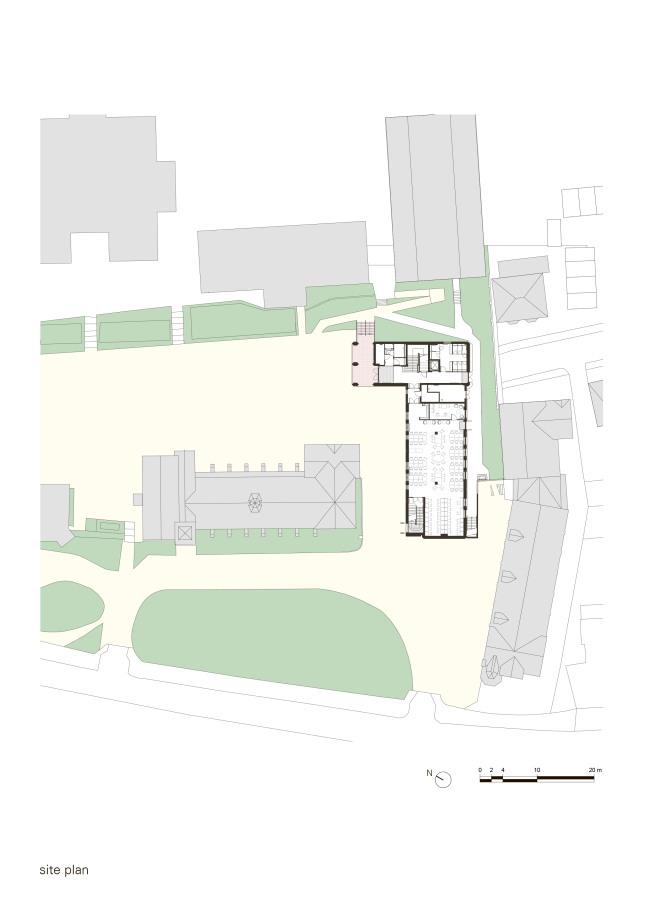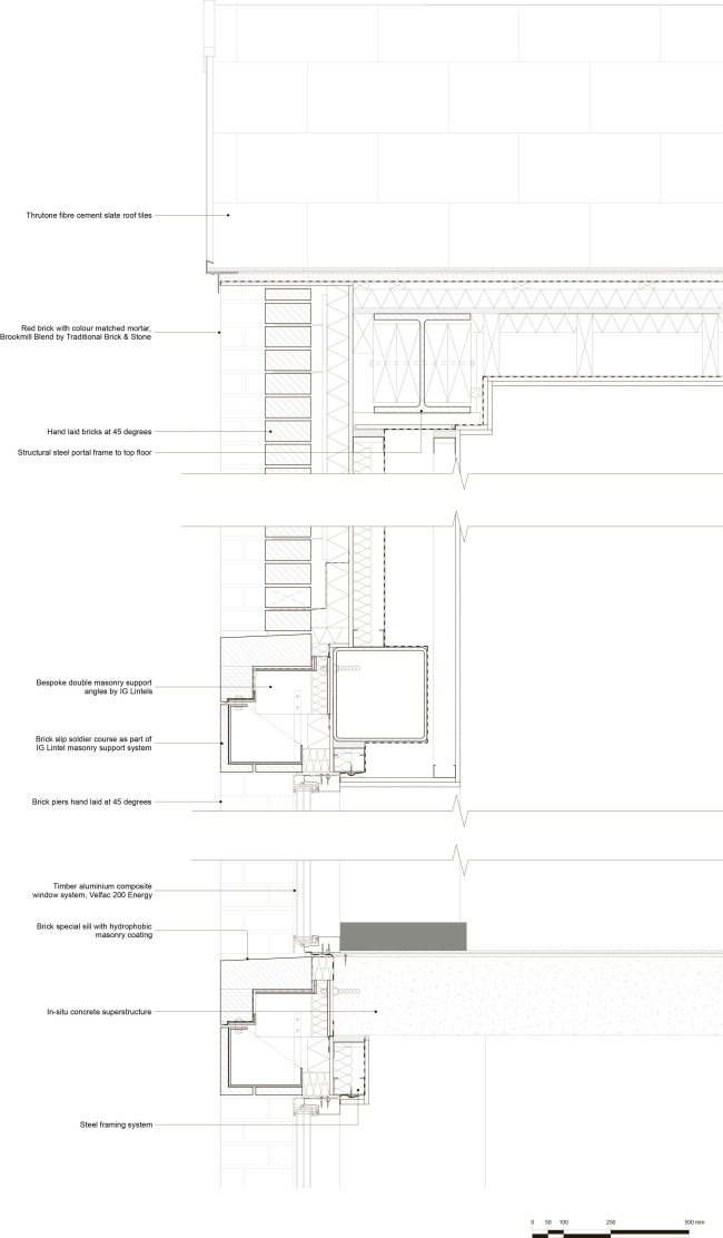 Новый корпус развивает мотивы, заимствованные у исторических корпусов: выразительный щипец, профили из выложенного под углом в 45 градусов кирпича как версия декора из треугольников, вместо горизонтальных поясов из камня – перемычки из вертикальной кладки.