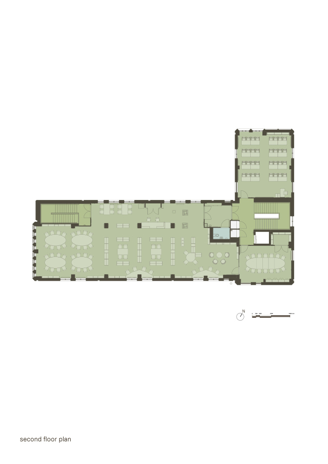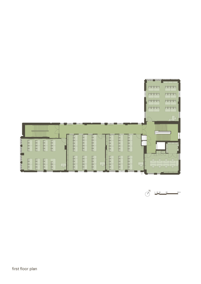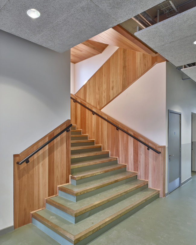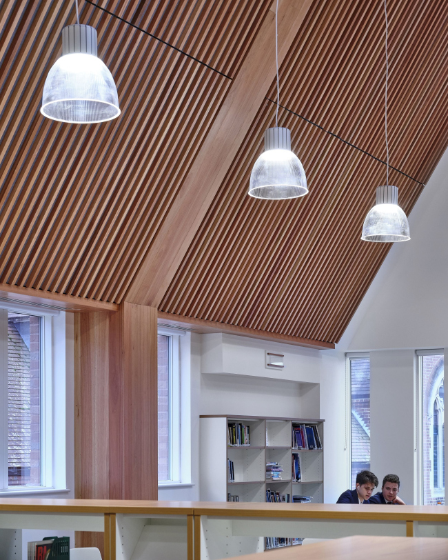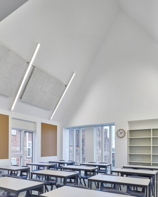 На первом этаже находится учебный центр для шестого, самого старшего, класса: на площади в 200 м2 есть тихая зона для индивидуальных занятий и отдельные, «неформальные» пространства, граничащие с рекреацией. На втором этаже – классы английского языка, а на самом верху, под крышей – наполненная светом библиотека.Школа СкиннерсФото © Kilian O′Sullivan/VIEW