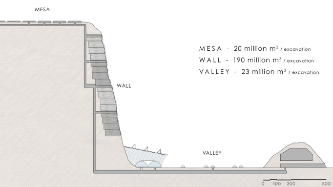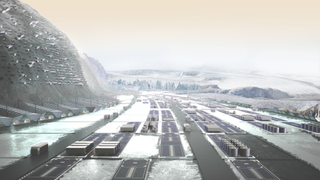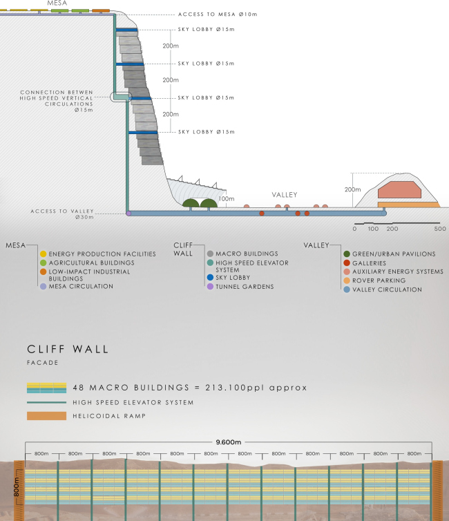 На поверхности скалы – там, где есть прямой доступ к солнечному свету – возведут сельскохозяйственные базы и солнечные электростанции. Здесь же инициаторы проекта планируют построить комбинаты по производству сине-зеленых водорослей, искусственного мяса и бактерий, которые будут заниматься переработкой отходов. А в некотором отдалении от марсианского города расположатся животноводческие фермы.