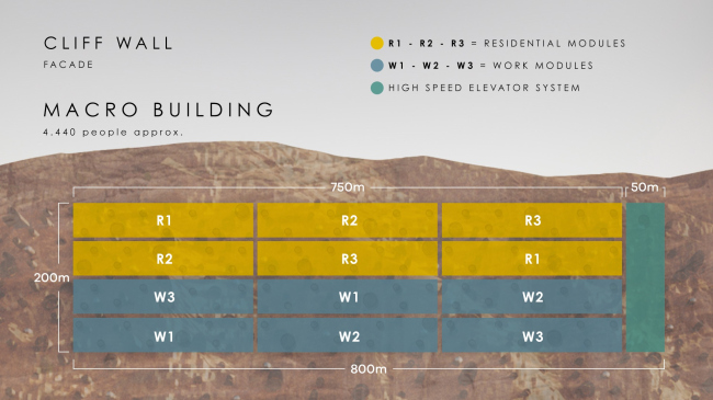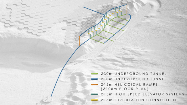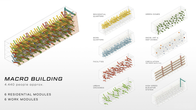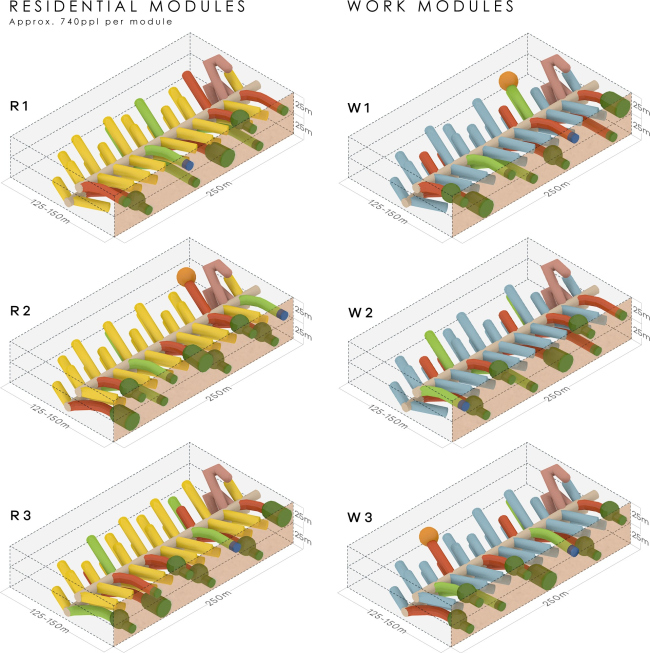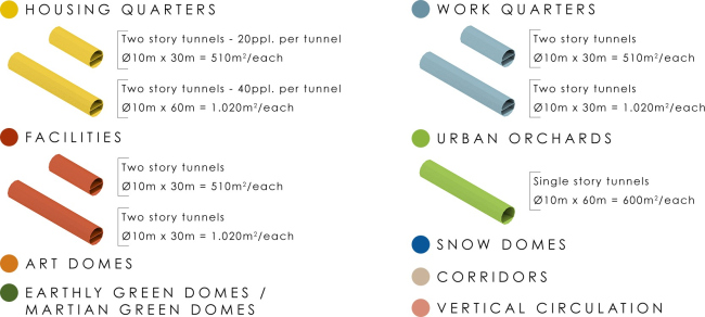 Внутри разветвленной сети тоннелей, выведенных наружу, разместятся двухэтажные модули диаметром 10 и длиной 60 метров. Блоки делятся на рабочие и жилые, в каждой типологии представлено по три модели – при необходимости их можно комбинировать между собой. Капсулы содержат небольшой сад, арт-пространство и зону сбора конденсата, которая помогает отводить тепло и очищать воздух.
