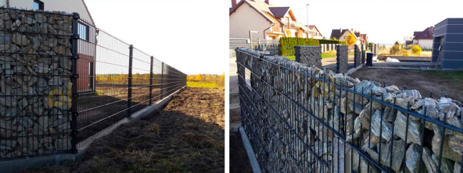 Габионы и сегменты 2D (3D). Совместное использование сегментов 2D и габионов. Количеством габионов можно регулировать степень открытости забора. Габионы не требуют ленточного фундамента, а регулировать степень закрытости сегментов 2D (3D) принято с помощью растительности (живой изгороди).