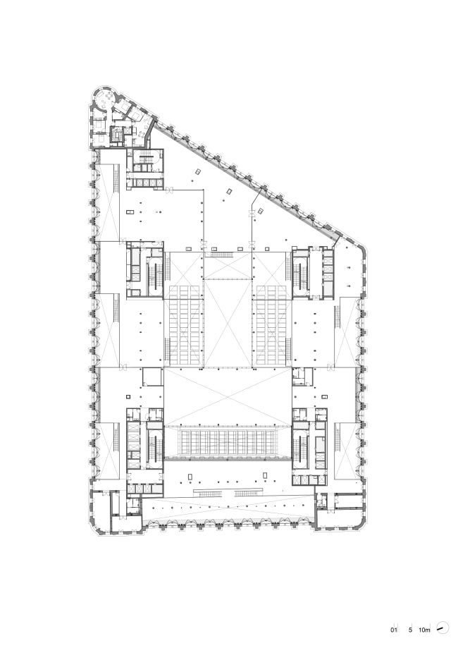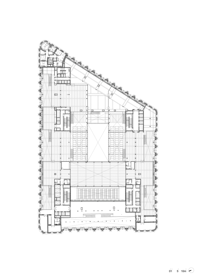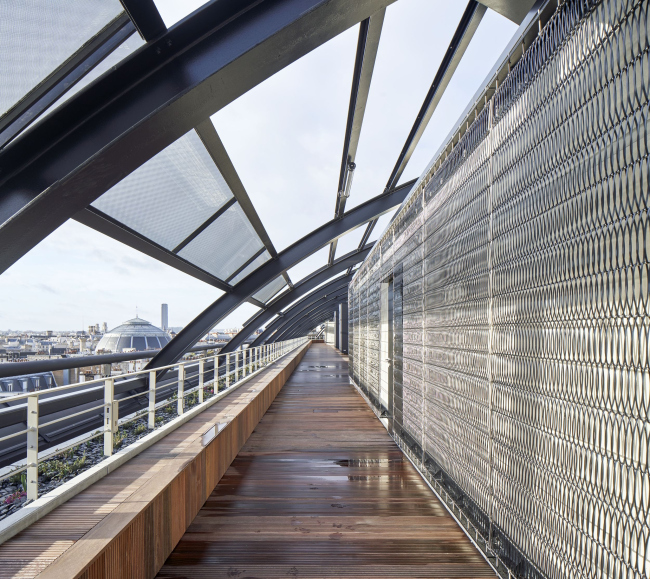 Острый угол здания отдан под социальное жилье (17 квартир), верхний этаж занимает отель на 84 номера, а также бар. Есть и терраса на крыше, где могут поместиться 399 гостей. Для тяжелых верхних ярусов предусмотрен свой, современный каркас, независимый от исторического.Луврский почтамт – реконструкцияФото © Michel Denancé/Dominique Perrault Architecte/Adagp