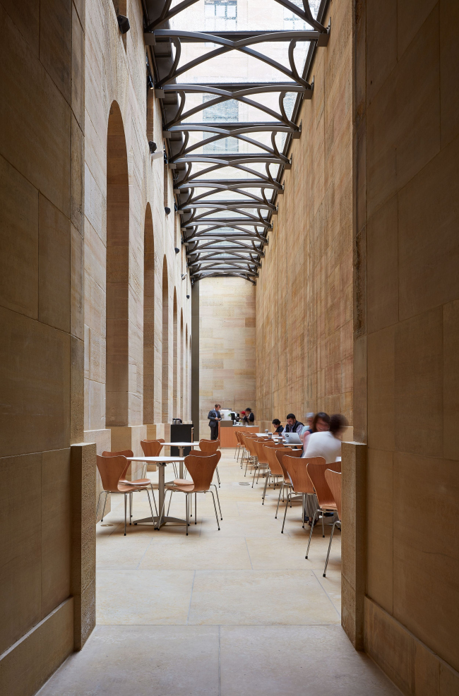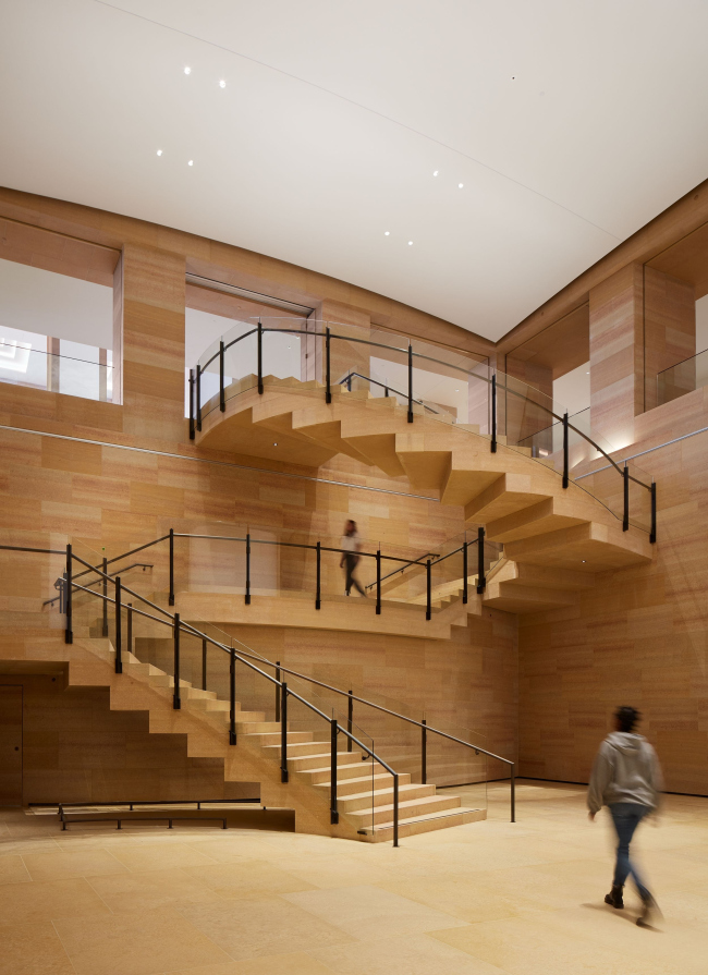 За Ленфест-холлом расположен совершенно новый зал – Уильямс-форум. С уровня вестибюля туда спускается изогнутая лестница – вновь облицованная известняком, но своей формой все же напоминающая о типичных проектах Фрэнка Гери. Это единственный «смелый» компонент проекта, остальное подчеркнуто традиционно и сдержанно, хотя даже при работе с наследием для Гери такое не характерно.