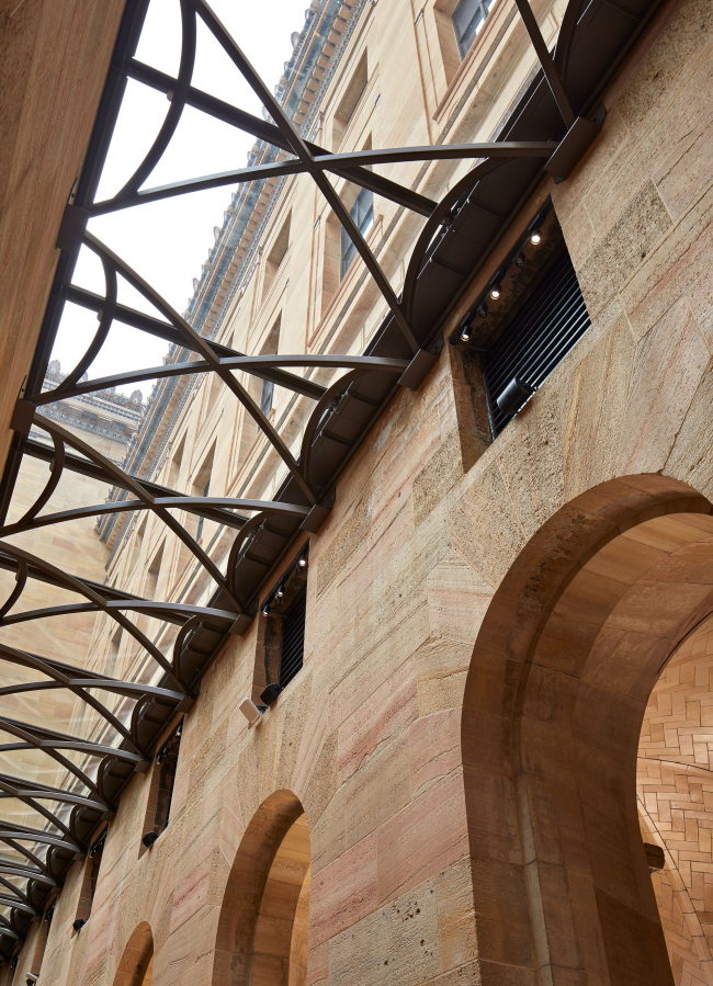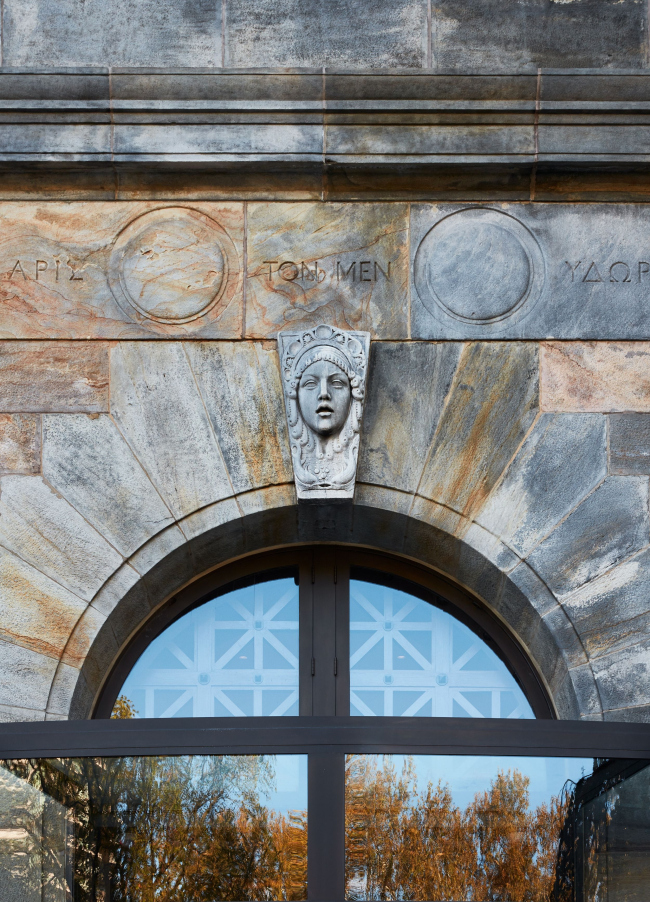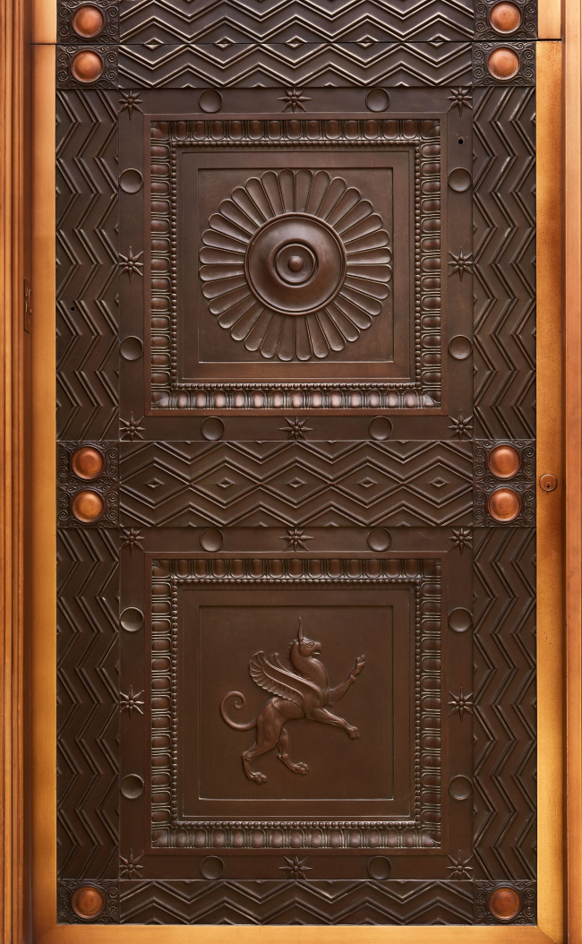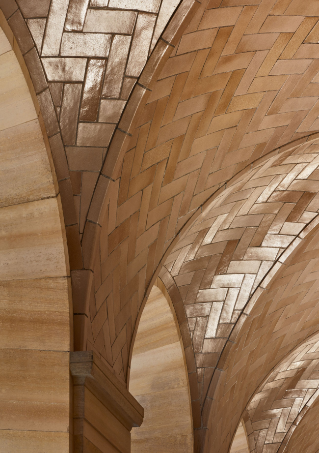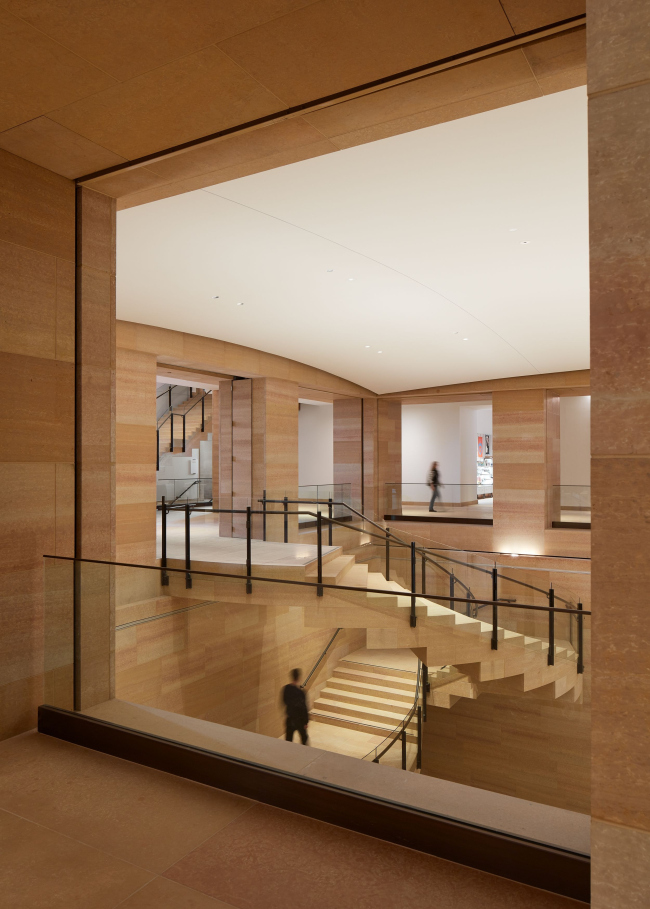 При реконструкции там и в других частях музея основным материалом стал тот же золотистый известняк из Миннесоты, что был применен в 1928. Также использовались стекло и бронза.