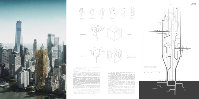 Этот небоскреб предлагается не построить, а вырастить. Дерево-башня – живой организм со своей корневой системой, потребностями в питании и уходе, особенностями развития и т.д. Это несколько генетически модифицированных быстрорастущих и способных достичь нужных высот лиственных деревьев, которые высаживаются группами в специально подготовленную почву и в процессе роста формируют уникальный архитектурный объем. Ствол со временем будет становиться все крепче, а конструкция «здания» – прочнее.