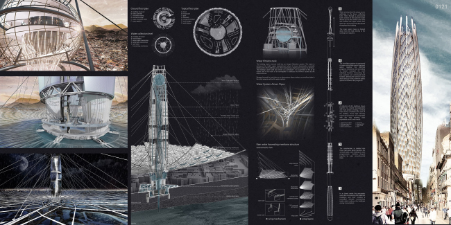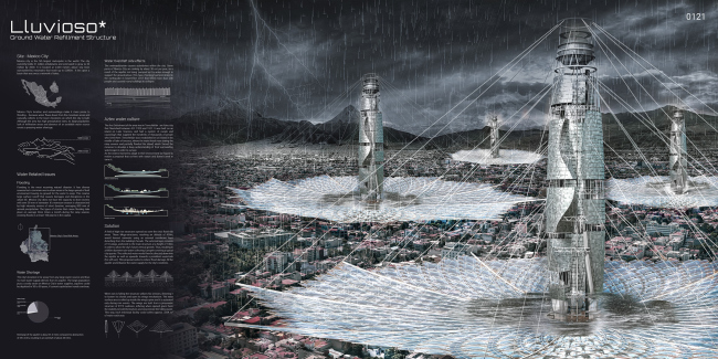 Придуманный для Мехико многофункциональный небоскреб благодаря внешнему мембранному слою способен собирать дождевую воду и пополнять подземные водные запасы. Такие здания предлагается «разбросать» по зонам, подверженным наводнениям, поскольку вертикальное размещение городских функций в таких областях позволит минимизировать ущерб в случае затопления.