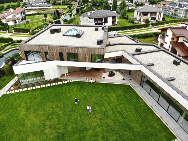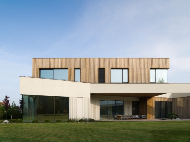Дом, построенный по проекту Александры Хелминской-Леонтьевой в подмосковном поселке «Миллениум Парк», стремится к гармонии с окружающим природным ландшафтом. Строгие формы и ясные линии придают дому характер, шероховатый архитектурный бетон и дерево в облицовке сообщают ему тепло, а светопрозрачные стеклянные конструкции позволяют естественному свету и зелени проникать во все уголки дома, наполняя его уютом.