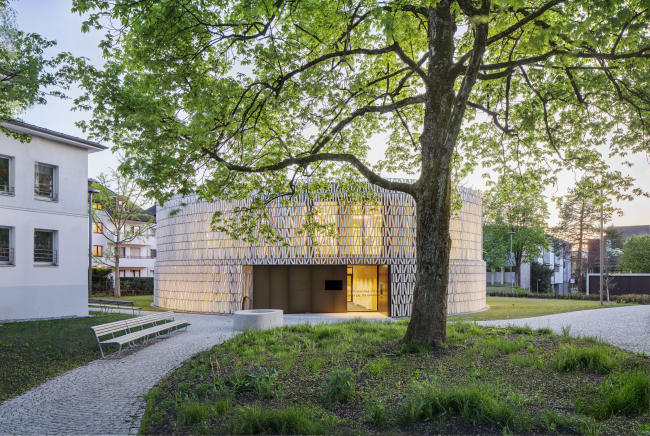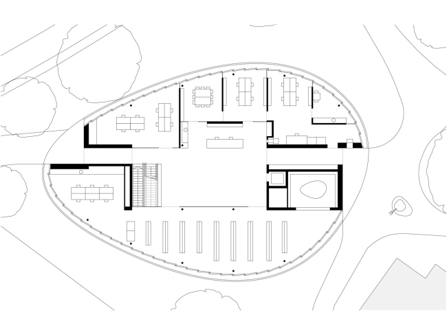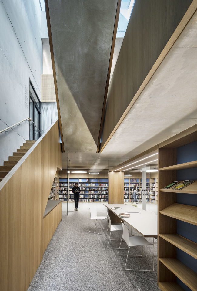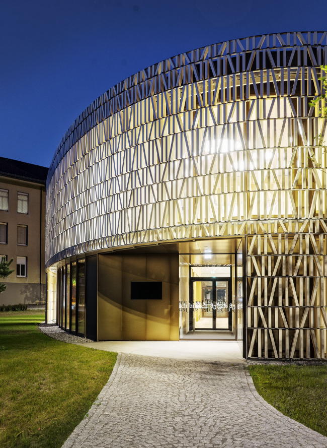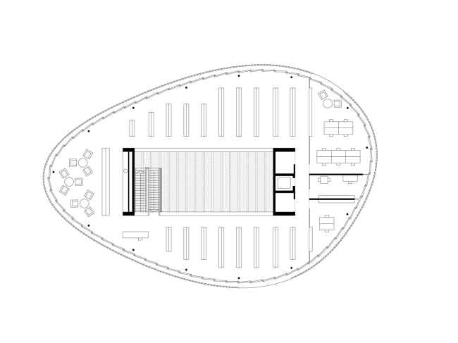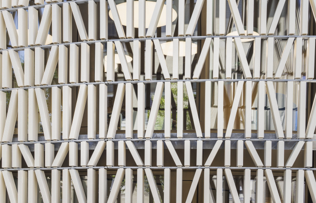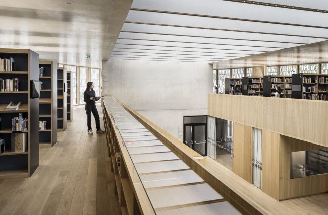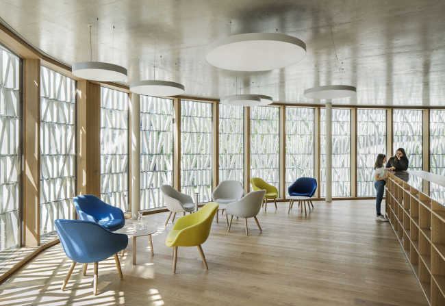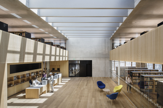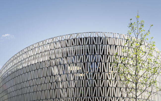 Овальный объем нового здания контрастирует с обычными, прямоугольными постройками вокруг. Снаружи он закрыт ажурным керамическим экраном, имитирующим книжные полки и защищающим интерьер от солнца. За ним на расстоянии 70 см находится основной фасад с тройным остеклением.