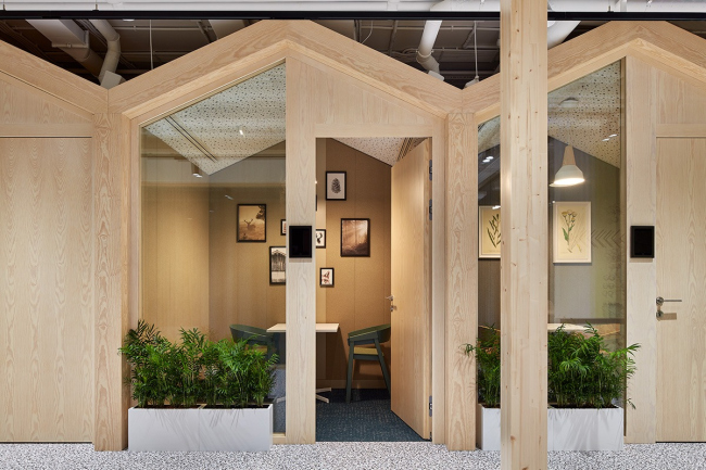 Joom Group – компания-владелец одноименной торговой онлайн-площадки. Архитекторы постарались сделать жизнь в офисе максимально насыщенной – перемещаются здесь на самокатах; в центре пространства разбит настоящий парк, а примыкающие к нему «фасады зданий» условно делят территорию на Россию, Европу, Америку и Азию; есть игровая зона, музыкальная комната, каминная, библиотека и т.д. В противовес всему этому – сдержанный опен-спейс, в котором ничего не отвлекает от рабочего процесса.