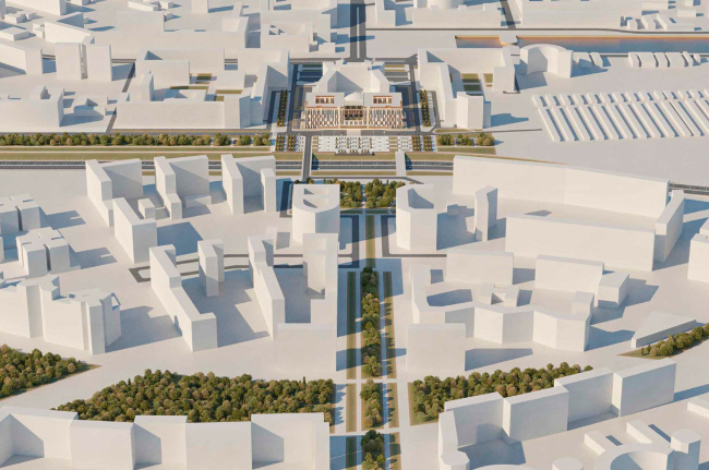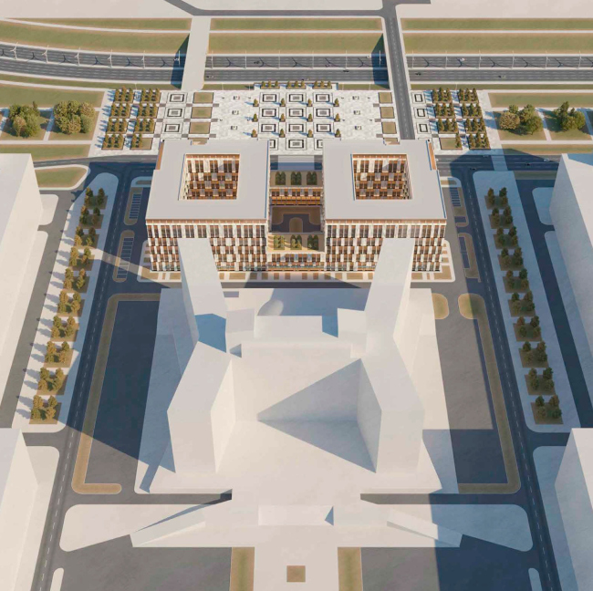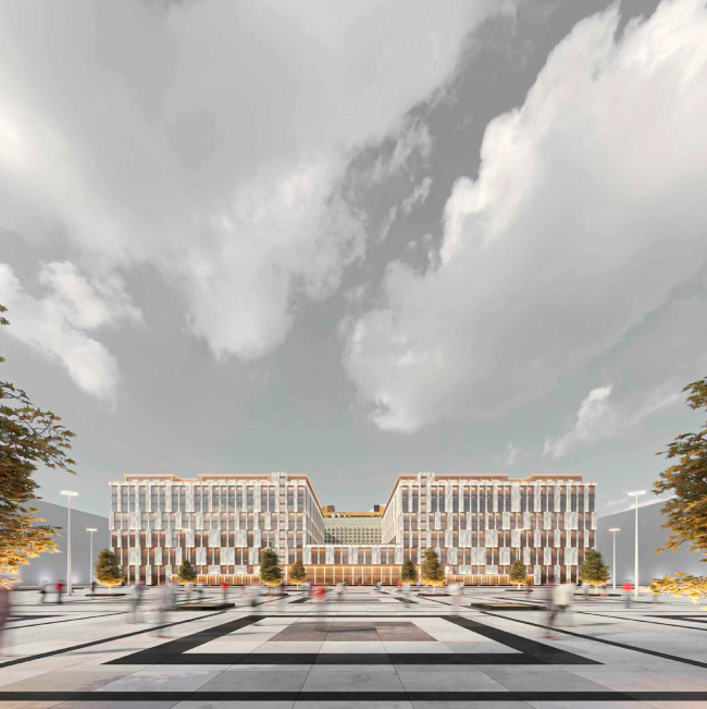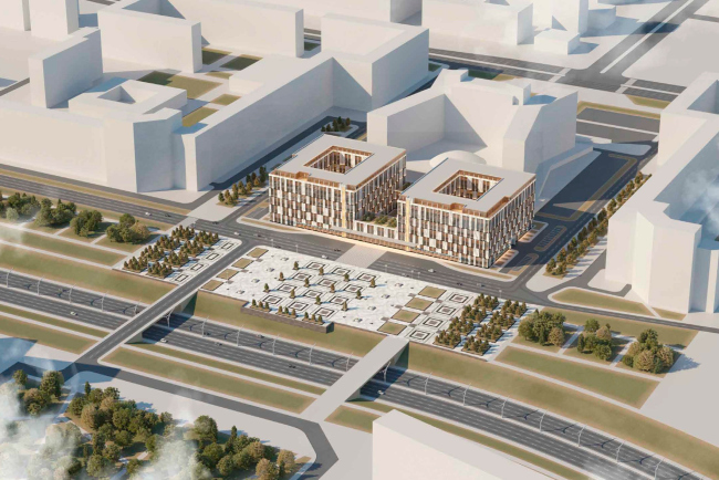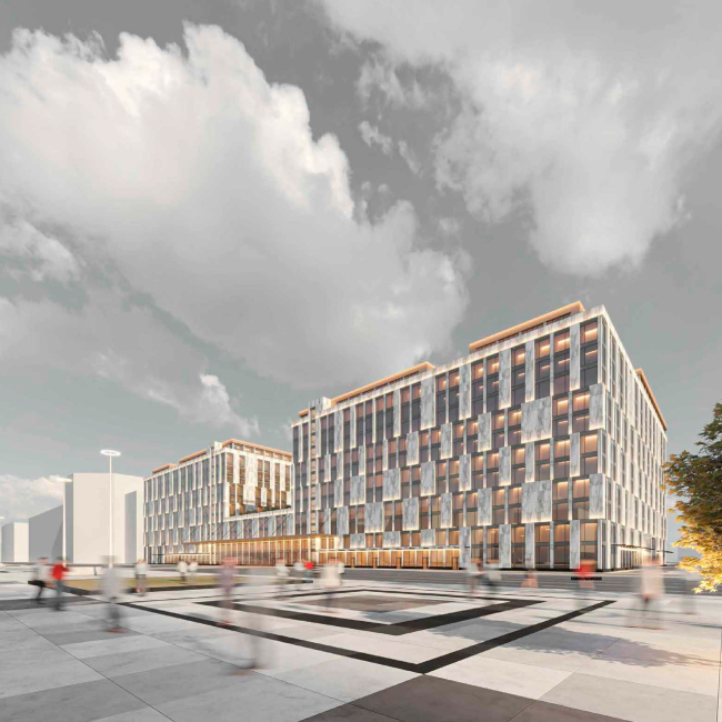 Мастерская предложила два симметричных кубических корпуса, объединенных четырехэтажной перемычкой, равной по высоте ресторану «Прибалтийской». Номера через каждые два этажа отличаются, что на фасадах нашло отражение в переменном шаге проемов и простенков. Фасады облицованы керамическими плитами, на которые нанесена фактура естественного камня, а также латунными вставками. Заказчик, имя которого осталось не известным для архитекторов, готов финансировать реконструкцию остатков площади.
