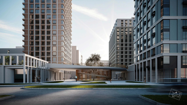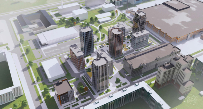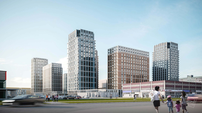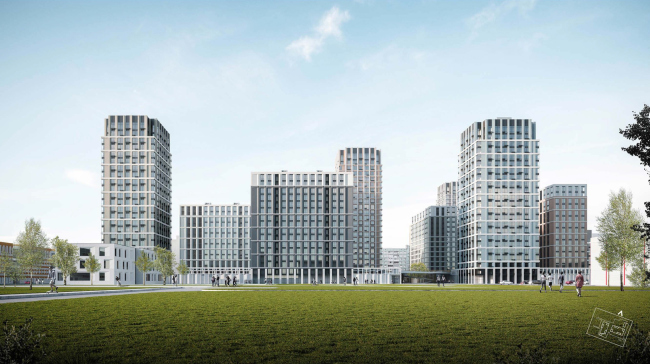 «Проектная культура» запрашивают отклонение от разрешенных 40 метров до 75: в результате на участке свободно расположатся восемь башен от 15 до 24 этажей, появится силуэт и больше пространства для благоустройства и пристроенного детского сада. Корпуса объединяют два стилобата, между которыми перекинут мостик. Про фасадные решения Александр Зюзин рассказал следующее: «Каркасная сетка светло-серого цвета присутствует на всех корпусах, где-то она подчеркнута горизонталями, где-то идет волной. Преобладают четыре спокойных цвета из традиционной петербургской палитры, два теплых и два холодных».