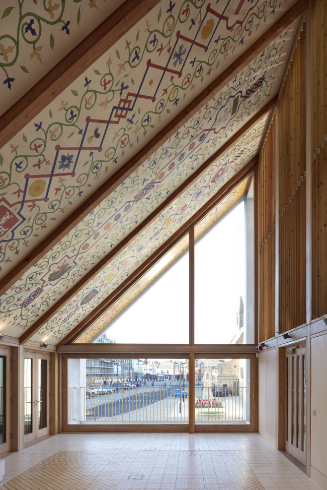 Устройство собственно посетительского центра напоминает о длинном зале, типичном для средневековой Англии типе сооружения. В старину это мог быть зал для рыночной торговли, а в наши дни там располагается информационная стойка, билетная касса, пространство для выставок и мероприятий. Снаружи стены центра покрыты текстом об истории замка, а внутри перекрытия расписаны в традиционном духе.
