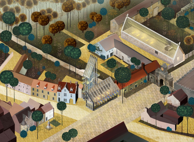 Окландская башня – посетительский центр, совмещенный с смотровой вышкой, откуда можно осмотреть город и замок, поля и леса с высоты – встречает посетителей отреставрированного ансамбля. Каркасное сооружение из клееной древесины европейской лиственницы должно напоминать о легких временных постройках, окружавших стены замка много веков назад. Дерево покрыто серебристым составом, который ускоряет его «старение». Со временем он сотрется, и взгляду откроется уже естественный серебристый цвет древесины. Дерево в интерьере при этом сохранит золотистый цвет.