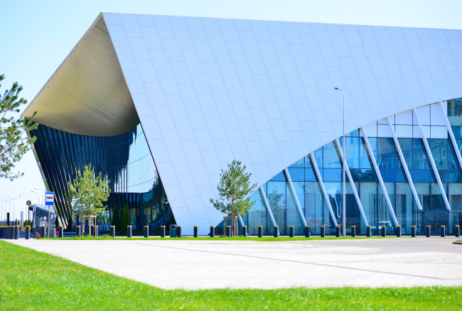 Для реализации идеи за основу были взяты 2 материала – стекло и металл. Их гармоничное сочетание сделало здание аэропорта уникальным: визуально хрупким и невесомым, а в действительности – надежным и долговечным. К слову, боковые фасады объекта также решены в этих материалах, однако выглядят лаконичнее и сдержаннее.