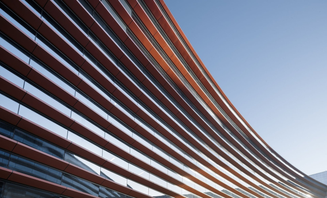 Границы прямоугольного в плане участка повторяют внешние стены комплекса: с трех уличных сторон они облицованы камнем и прорезаны воротами-арками, с четвертой, «водной», фасад, как упоминалось, остеклен. Однако внутри геометрия совсем иная: сложный криволинейный план двора-площади призван напоминать о форме старинной печи для обжига керамики. Ее силуэт прочитывается в этом пустом пространстве, окруженном тремя корпусами: сами они получили ламели на фасадах кирпичного цвета как еще одну дань прошлому.
