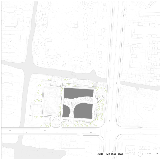 Архитектурный проектно-исследовательский институт Чжэцзянского университета (UAD) занимался проектом комплекса из музея и библиотеки, когда еще не было ясно, что появится на соседних участках, поэтому авторы сосредоточились на порученной им территории, решив ее как самодостаточную.