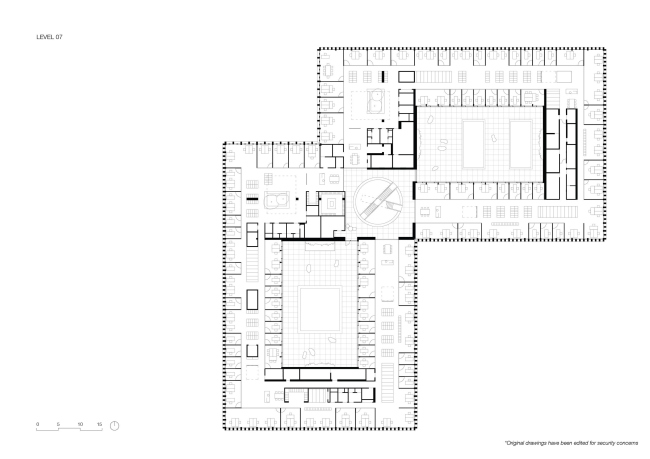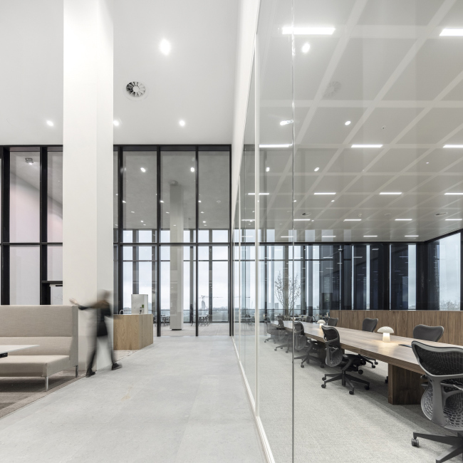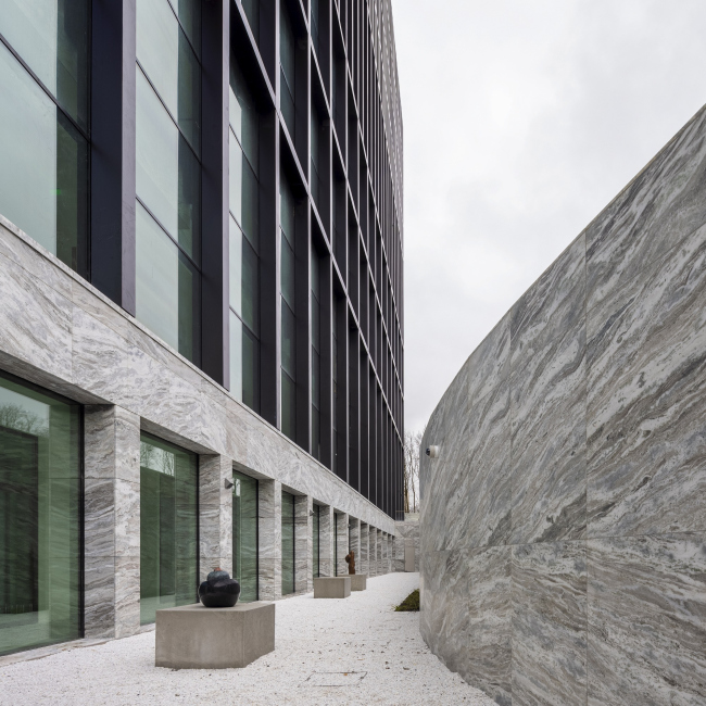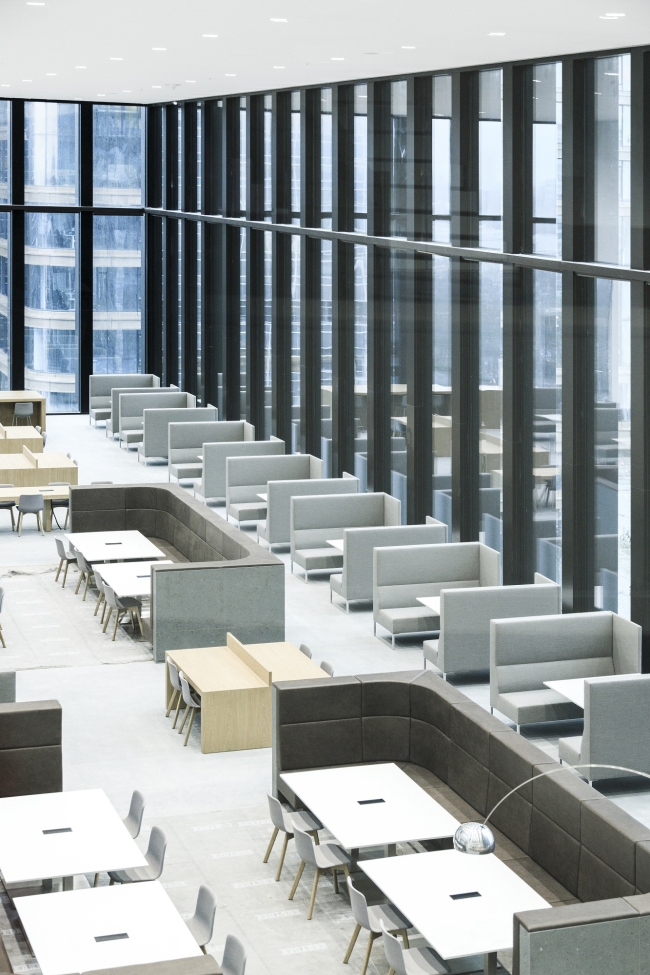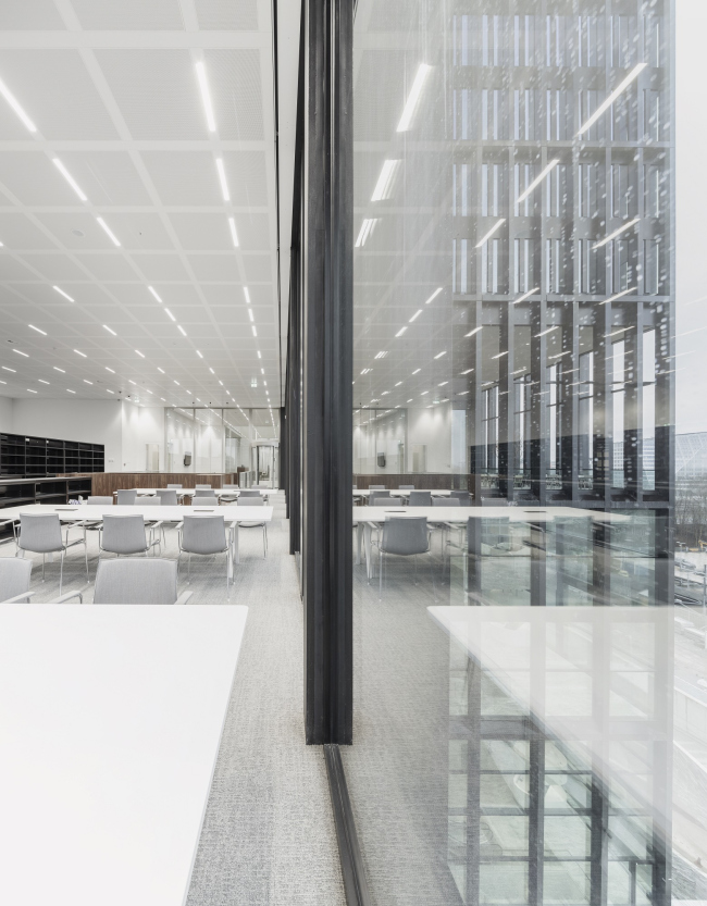 Внутри здание наполнено светом, отовсюду открываются виды города. В центре каждого из двух корпусов устроен внутренний двор, дополнительно обеспечивающий естественное освещение в интерьере.