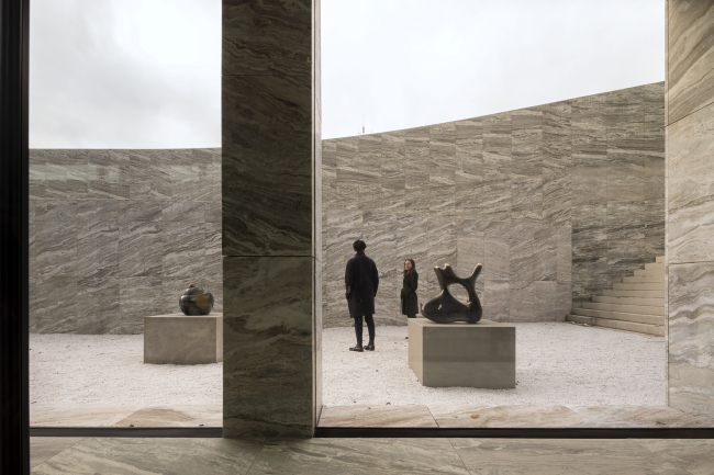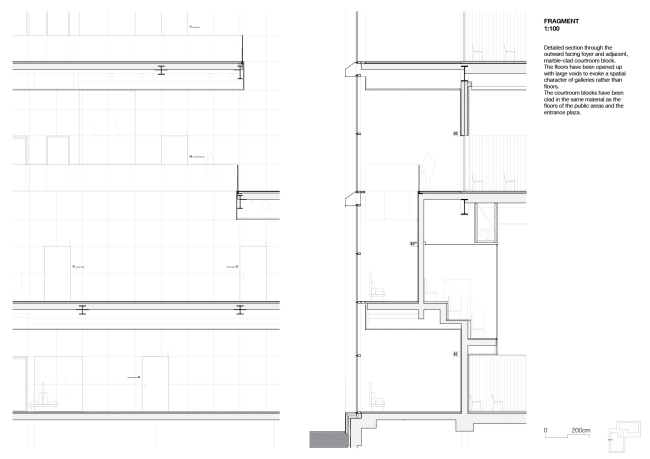 Поэтому 50-метровая постройка подчеркнуто открыта и прозрачна, а еще выглядит совершенно не претенциозно. Остекленные фасады позволяют заглянуть внутрь, особенно на уровне земли, где устроена просторная площадь в половину футбольного поля размером (она занимает четверть участка под строительство). Она вымощена тем же камнем, как пол в вестибюле, и скамьи там стоят такие же, и даже козырек входа выдается одинаково наружу и в интерьер. Так смягчается граница между судебным зданием и городским окружением. Даже обеспечивающие безопасность «пандусы»-ограды сделаны насколько возможно незаметными, зато высажены деревья цветущих весной видов.