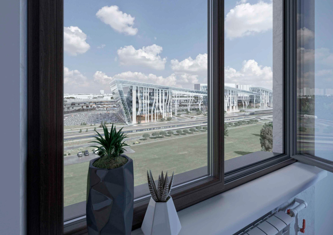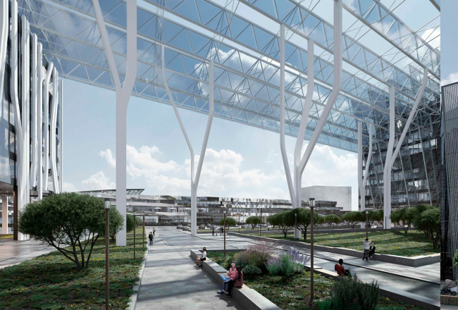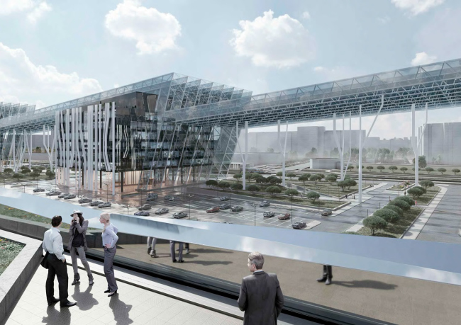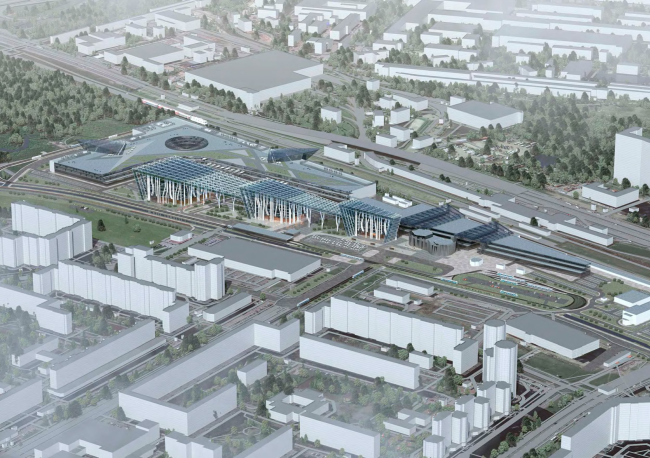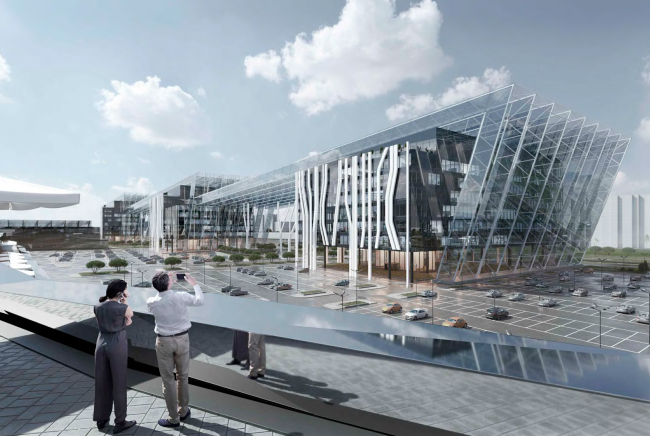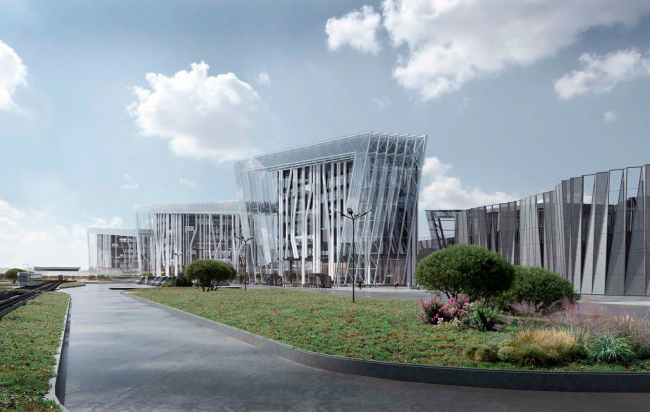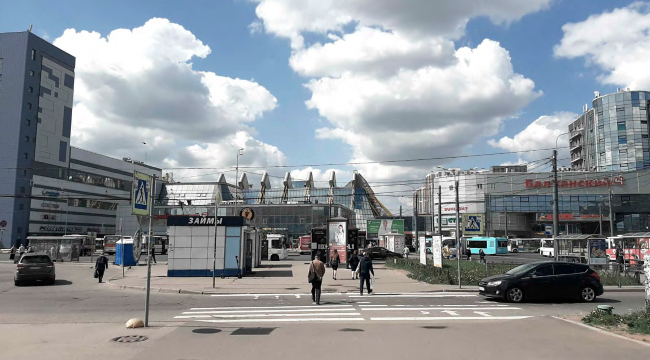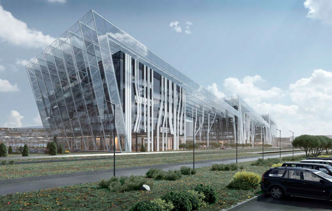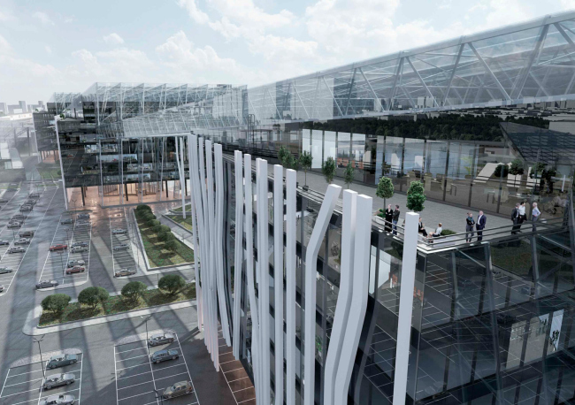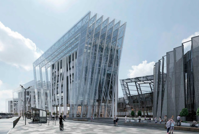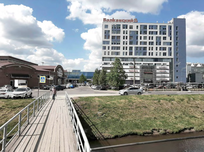 Вынесенный на обсуждение проект – по сути предложение по осовремениванию территории ТК «Балканский», где все еще жив дух конца 90-х годов. Габариты вытянутого вдоль железной дороги корпуса сохранят, остальные корпуса снесут и заменят на три новых объема, в которых расположатся парковки, офисы и торговые точки. Площадь проектируемых зданий будет вдвое больше существующих, при этом освободится место для открытых парковок, озеленения и променада, также архитекторы предлагают сделать атриум с высокоствольными деревьями внутри основного здания комплекса. Три корпуса со стороны жилой застройки и реки Волковки будут связаны декоративными остекленными фермами, абрис которых должен напоминать снежные вершины Балканских гор, и белыми ветвистыми опорами. Для большей проницаемости территории в первых этажах устроены галереи. Высота зданий не превышает 40 метров.