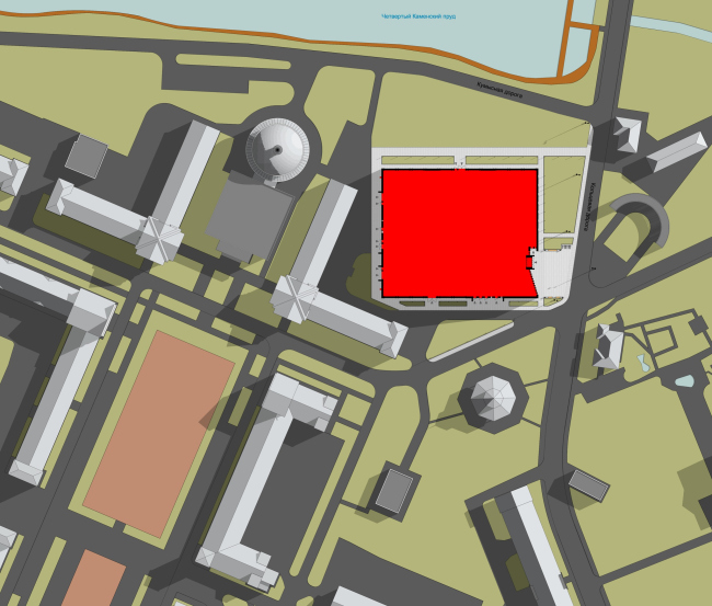 Новое здание общей площадью почти 8000м2 займет «двор» павильона №43 – когда-то здесь располагался павильон «Собаководство», утраченный еще в 1970-е годы. По отношению к соседним зданиям и прилегающим улицам почти квадратный в плане манеж ориентирован не ортогонально – вероятно, из-за ограниченного участка и особых технологических требований. Главный вход обращен к Окружной аллее и располагается прямо напротив цветника и входной арки, ведущей к Городской ферме, – вместе все эти объекты образуют небольшую площадь.