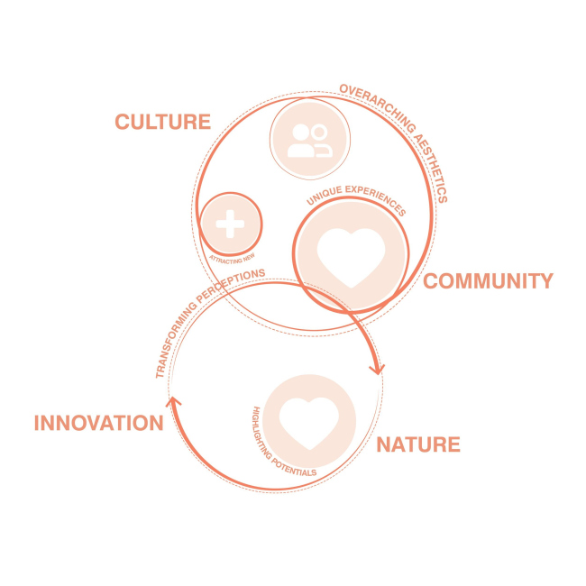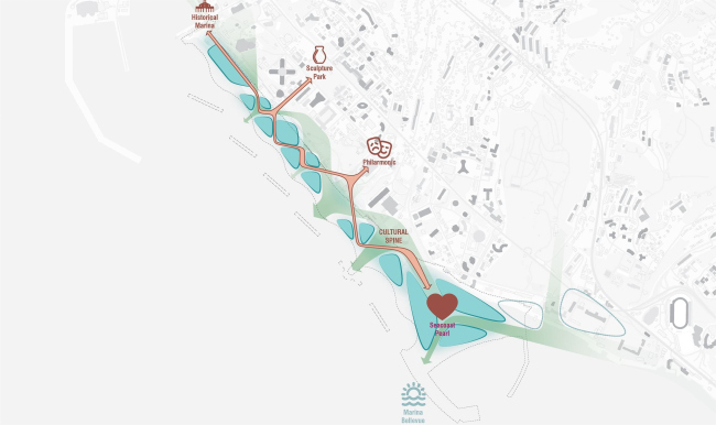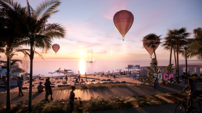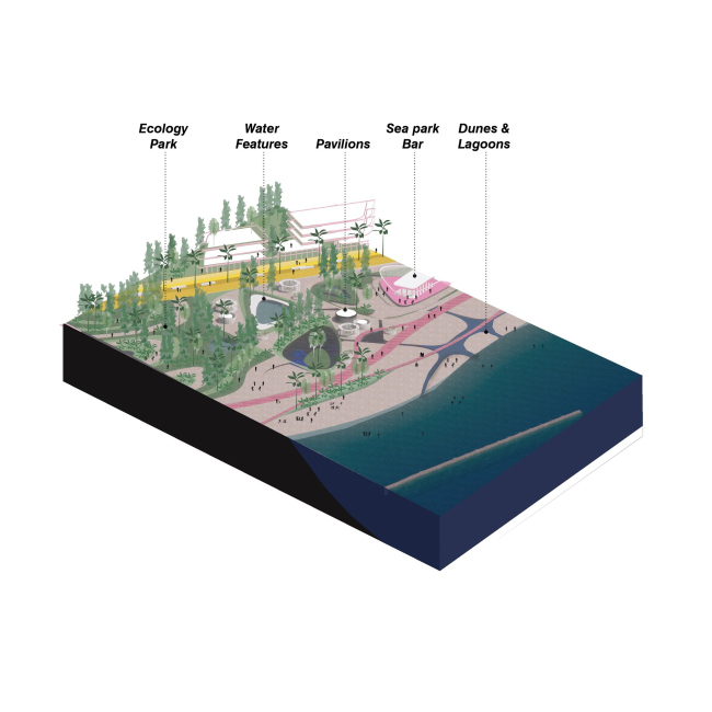 Конкурсное предложение включает «культурный стержень», который объединит основные учреждения культуры, а также вберет в себя крупные городские мероприятия: архитектурную биеннале, неделю дизайна, кинофестиваль и неделю моды. Градостроительная концепция основана на идее расширения пляжа. С его южного конца создадут новую пристань для яхт с Марина-Сити – многофункциональным центром с конференц-залами, отелями, развлекательными учреждениями, музеем дизайна и инноваций и яхт-клубом. С севера набережную завершит Фестивальная деревня с менее «формальным» набором мероприятий и типов активности – пляжные вечеринки, уличные праздники, концерты под открытым небом. Между этими двумя полюсами задумано постепенное повышение масштаба и интенсивности впечатлений при движении с севера на юг по районам SoCo Playgrounds, SoCo Arts & Culture и SoCo Healthy Lifestyle.