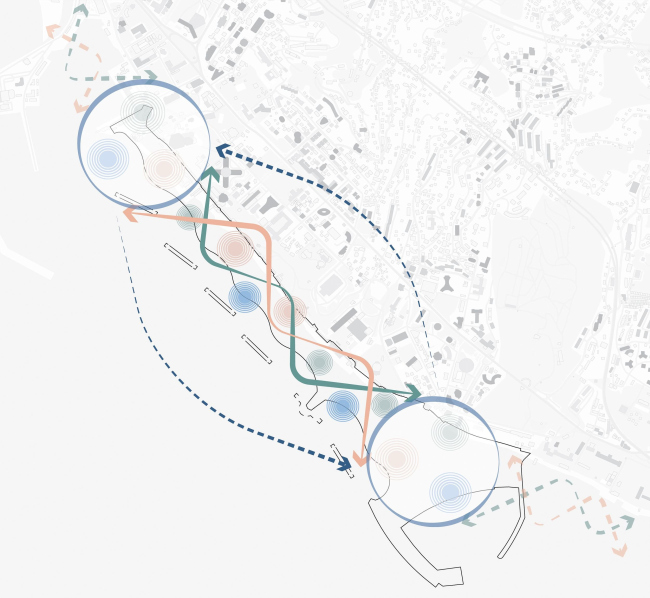 Вдоль моря можно продвигаться по трем маршрутам. Улочки с магазинами, барами и ресторанами удалены от воды, променад, напротив, идет по пляжу, а между ними проложена природная «Зеленая волна», по которой тоже приятно пройтись. Вдоль этих маршрутов расположены концертные залы, художественные галереи типа pop-up, рынок, ботанический сад, филиалы университетов и культурных учреждений, летние кинотеатры и т. д.Приморская набережная в Сочи – концепция© UNStudio. Предоставлено UNStudio