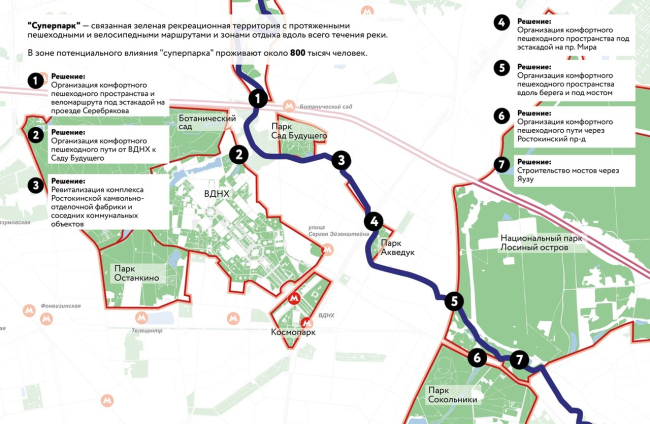 Будучи реализована, концепция улучшит функционирование нескольких крупных парков: Сокольников, Лосиного острова, ВДНХ, зеленых зон Яузы и Чермянки в северной части города и других рекреационных зон меньшего масштаба. Связывая их между собой новой велопешеходной и, подчеркну, также беговой инфраструктурой, она делает значительную часть города более проницаемой для жителей, перебрасывает «мостики» в самых сложных местах.