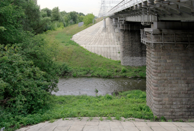 Авторы предлагают провести под этим мостом три дорожки: велосипедную, беговую и пешеходную, – вдоль правого берега Яузы, приподняв их на «экологические» опоры в месте понижения рельефа у пруда. Вокруг опор железнодорожного моста МЦК тропы, согласно проекту, разделяются, одна них проходит над кромкой берега и даже над водой.