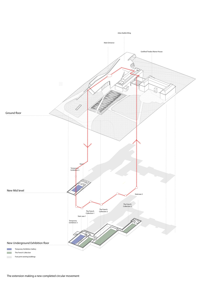 Îñíîâíîé ìàðøðóò, ïî çàìûñëó àðõèòåêòîðîâ, âåäåò ïîñåòèòåëÿ ÷åðåç ãëàâíûé âõîä â çäàíèè Õàäèä èç ÷åðíîãî áåòîíà ïîä çåìëþ, ãäå â ïåðâûõ äâóõ çàëàõ – äëÿ âðåìåííûõ âûñòàâîê – íîðâåæñêèå àðõèòåêòîðû ïðîäîëæàþò åå çàìûñåë. Îò óðîâíÿ çåìëè òóäà ïðèâîäèò ëåñòíèöà, çàæàòàÿ ìåæäó ñòåí èç òåìíîãî áåòîíà.