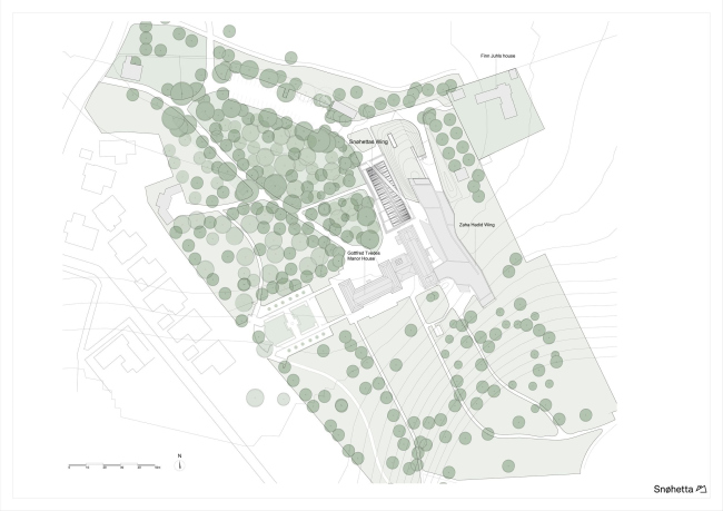 Ìóçåé Îðäðóïãîð (Ordrupgaard) ñ îáøèðíîé êîëëåêöèåé ôðàíöóçñêîé è äàòñêîé æèâîïèñè ðàñïîëîæåí â óñàäüáå íà÷àëà XX âåêà.  íà÷àëå íàøåãî ñòîëåòèÿ åå ðàñøèðèëè, äîáàâèâ êðûëî ïî ïðîåêòó Çàõè Õàäèä. Ïðîåêò Snøhetta ñâÿçûâàåò ýòè äâå ÷àñòè êîìïëåêñà, ñòðåìÿñü ê ãàðìîíèè ñ îáîèìè.