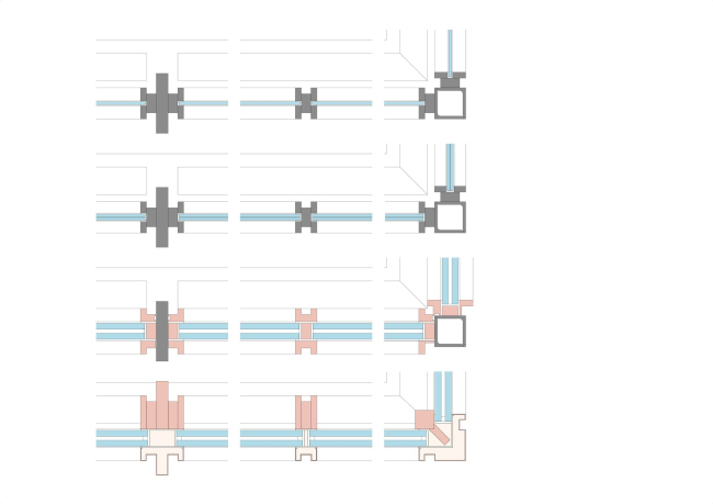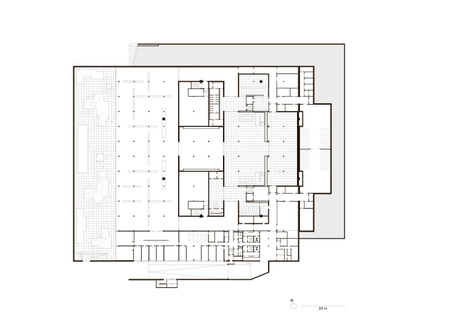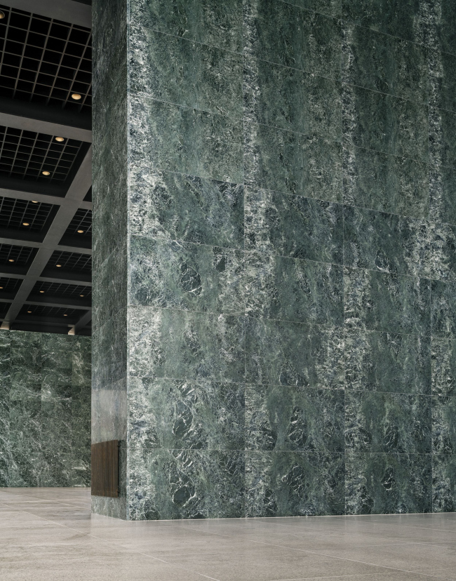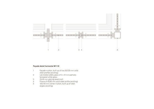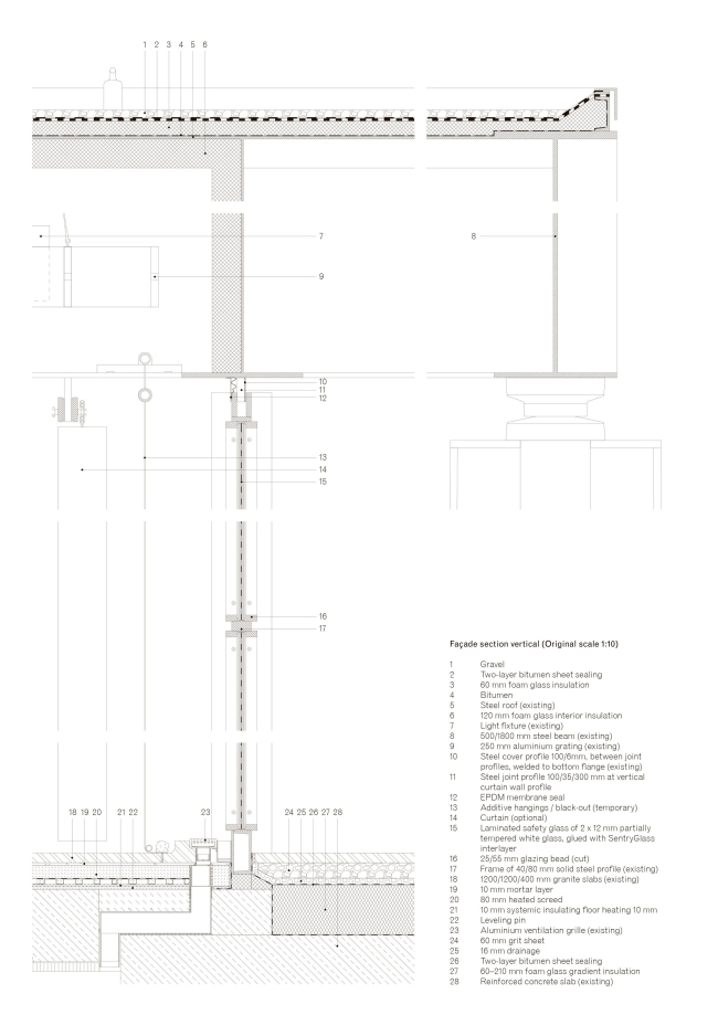 Бетонный подиум покрыт гранитными плитами по схеме вентилируемого фасада: это был один из первых «каменных» примеров такой системы в Германии, поэтому было важно сохранить и ее саму. При этом были ликвидированы добавленные позже деформационные швы, их заменили стандартные по ширине, 6-миллиметровые. В ходе работ плиты были демонтированы, а затем возвращены каждая на свое прежнее место.