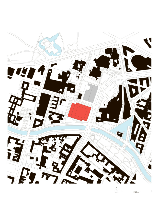 Новая Национальная галерея – реконструкция. Красным показаны изменения исторического здания при реконструкции© David Chipperfield Architects for Bundesamt für Bauwesen und Raumordnung
