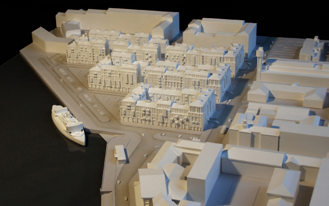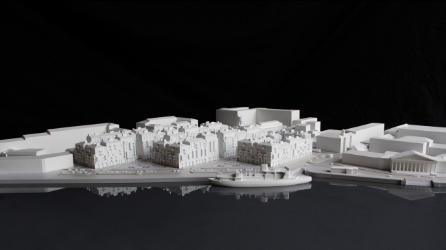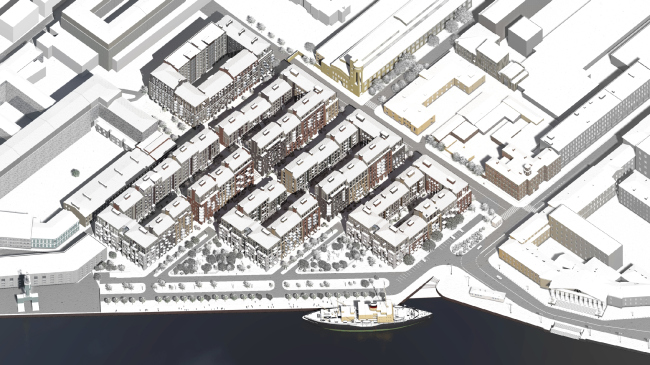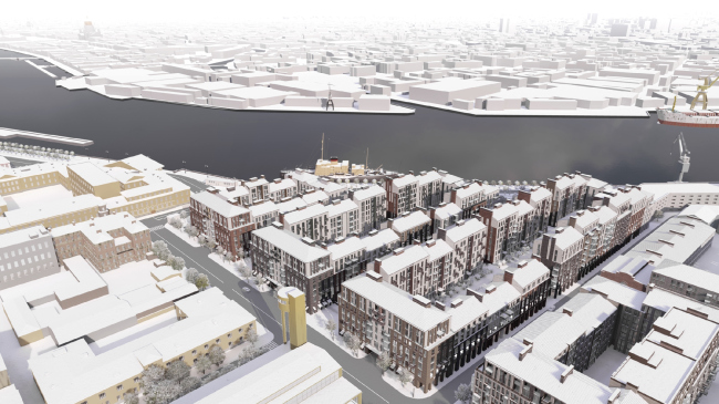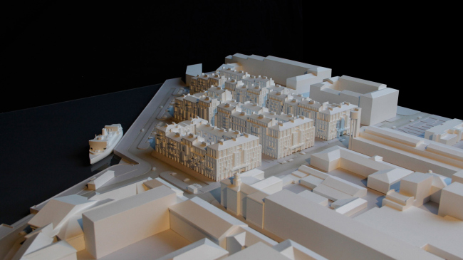 Получились компактные 4-6 этажные кварталы, подчиненные сетке Васильевского острова и в то же время нарисованные более регулярно, тонкими протяженными рамками. Нева здесь поворачивает, и прямоугольники планомерно вырастают по дуге, но не подчиняются скруглению набережной, а выступают вперед ступенями-углами. Этот планировочный прием авторы «подсмотрели» на соседней набережной XVIII–XIX века, где все фасады параллельны направлению проспектов Васильевского острова, и вписаны, таким образом, в общую ортогональную сетку. Перед дугой реки они образуют ступеньки-углы.