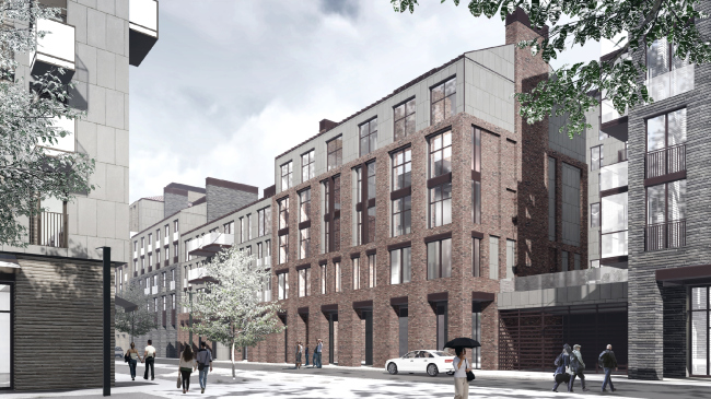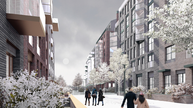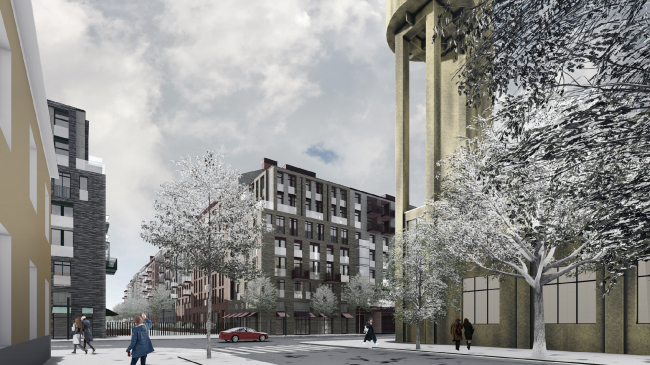 Отступы квартальных торцов в проекте также равномерны в духе «мегалитического» отношения к объемам, свойственного проектам Никиты Явейна. Каждый торец получает во фронте соседнего квартала продолжение в виде узких, как будто ножом разрезанных разрывов – они поддерживают поперечное направление сетки и обеспечивают лаконичные цезуры, позволяющие избежать слишком длинных рядов и открыть проходы во дворы.