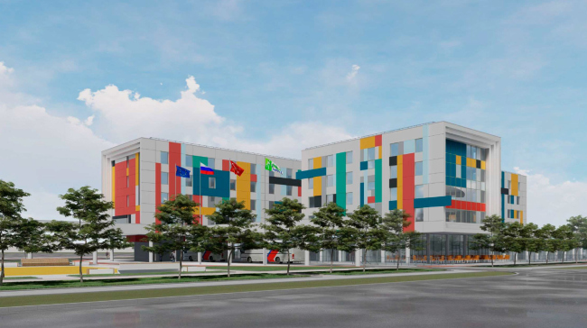 В плане здание напоминает, по словам Михаила Мамошина, меандр: в трех блоках располагаются номера, еще один отдают под офисные помещения. Цветовая гамма на фасадах тщательно выверена, каждый из них представляет собой композицию, вдохновленную работами Казимира Малевича, Якова Чернихова, Ильи Чашника, Николая Суетина. Оформление получили в том числе кессонированные торцы, не оставлена без внимания и эксплуатируемая кровля, где геометрических рисунок проявляется за счет разных трав и мхов, котельную превратили в цветной архитектон. Также мастерская подготовила предложение по благоустройству: три площадки, где с помощью мощения выложены первофигуры разных цветов.
