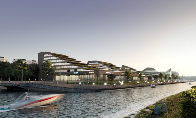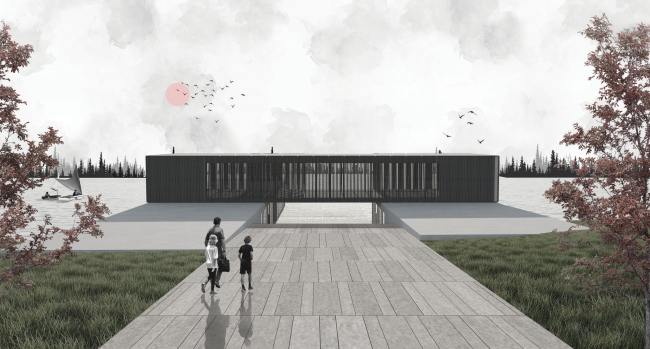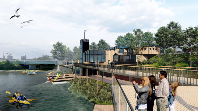 Архитекторы предложили сделать центр модульным, двухуровневым, состоящим из двух соединенных открытыми террасами блоков. Первый уровень – с доступом к береговой линии и с возможностью спуска на воду спортивного снаряжения. Второй – обеспечивает непрерывное благоустройство набережной и поддерживает пешеходные связи вдоль реки.