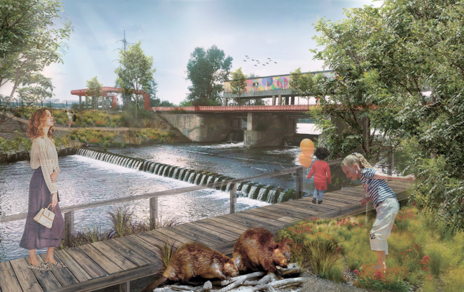 Территория речной поймы превращается из пространственного разделителя в парковую зону, призванную связать четыре городских района. В округе появляются новые точки притяжения – благоустроенные набережные, площади и скверы. Формируется сеть велосипедных и пешеходных маршрутов. Существующие зеленые пространства сохраняются, а на заброшенных территориях предлагается разместить эко-ориентированное жилье с необходимой коммерческой инфраструктурой. Также среди предложений – создание образовательных комплексов, коворкингов и бизнес-акселлераторов, за счет чего территорию поймы удастся сделать круглогодично используемой и востребованной.